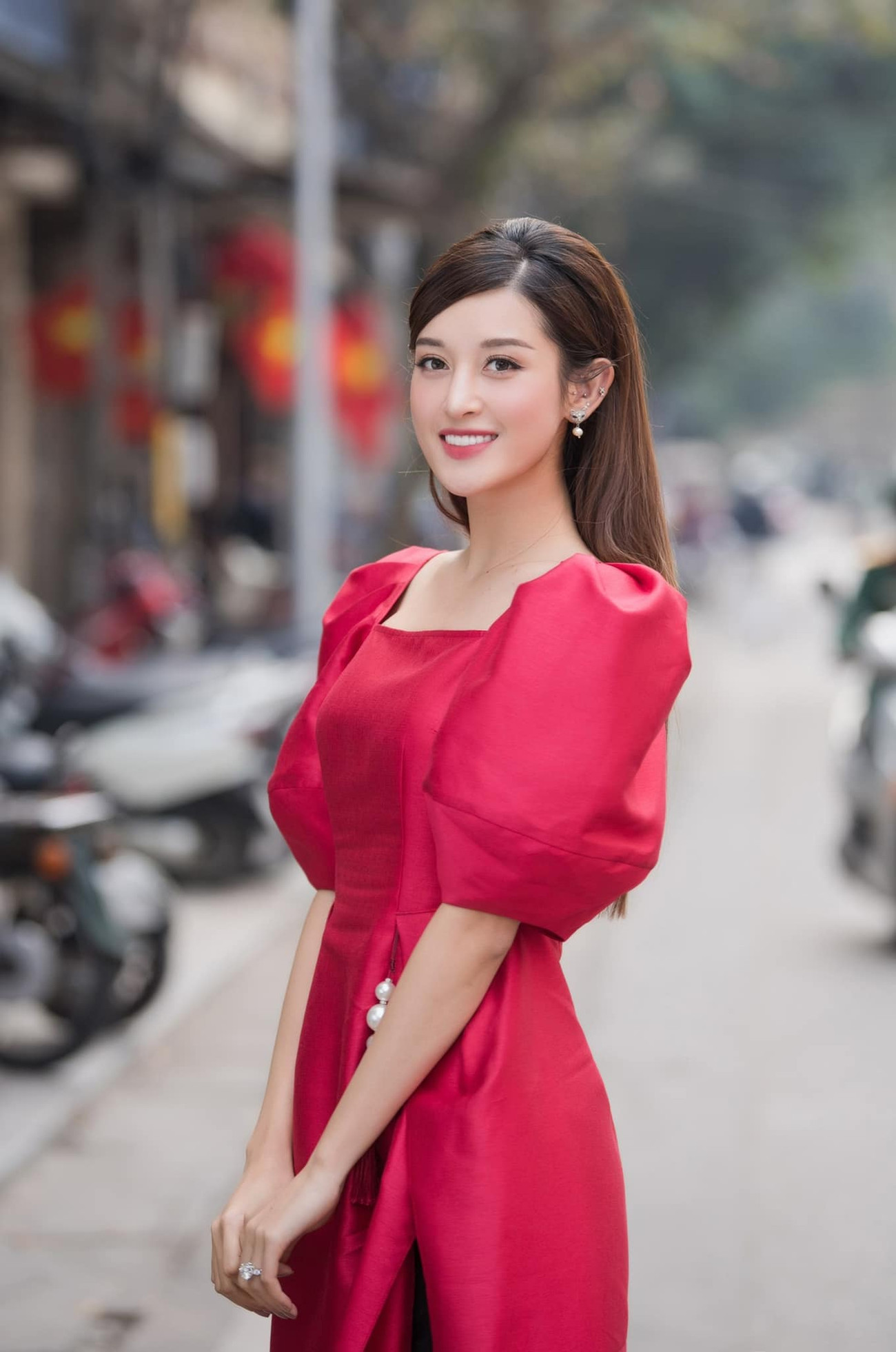 Á hậu Huyền My xinh đẹp rạng ngời khi diện tà áo dài cách tân tông màu đỏ rực, mang không khí Tết về tràn ngập.