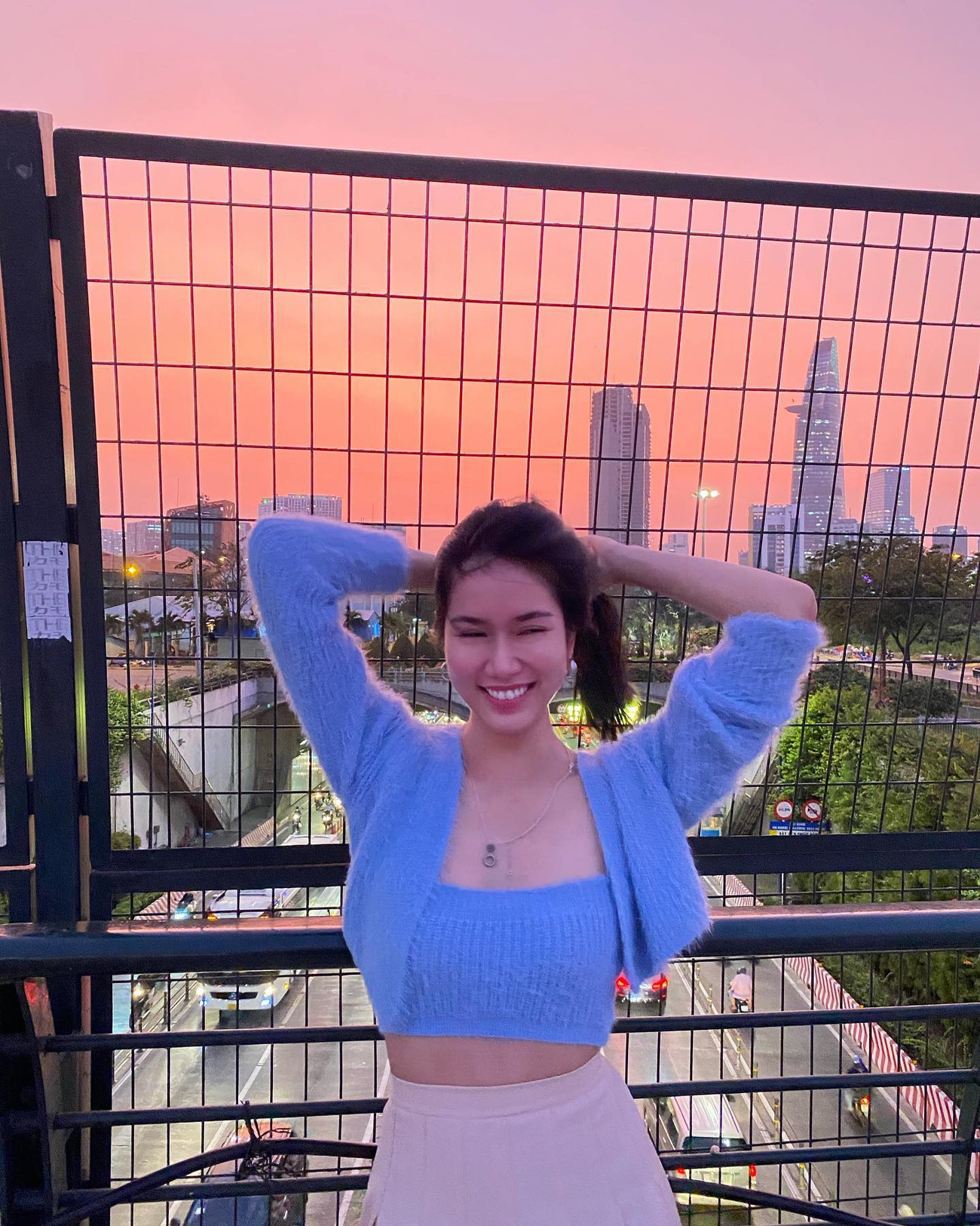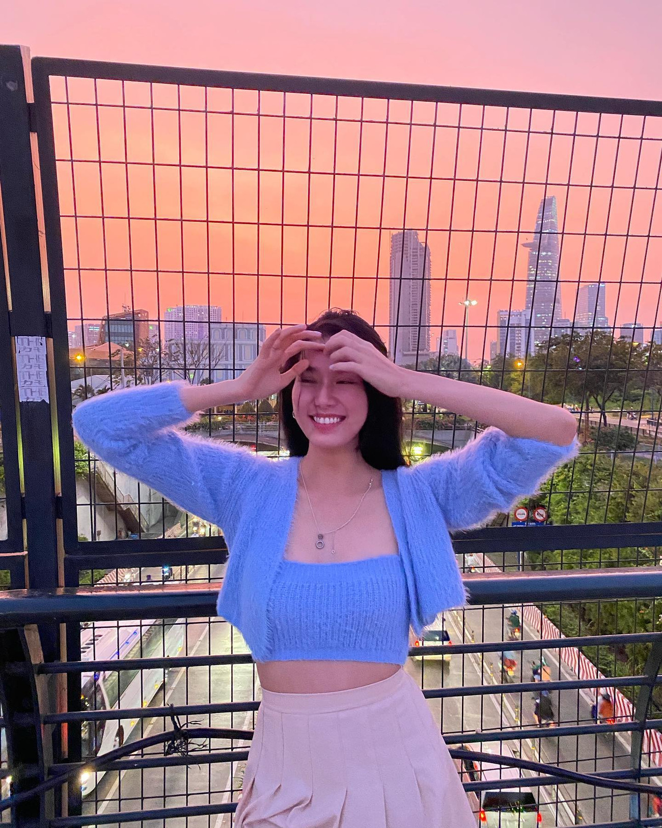 Á hậu Kim Duyên xinh đẹp rạng rỡ dưới ánh hoàng hôn dù diện trang phục giản dị.