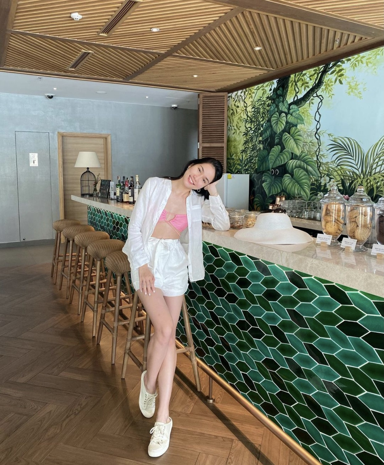 Á hậu Phương Anh khiến fans xuýt xoa khi diện bộ trang phục màu trắng kết hợp với áo tắm hồng nổi bật khoe vóc dáng quyến rũ.