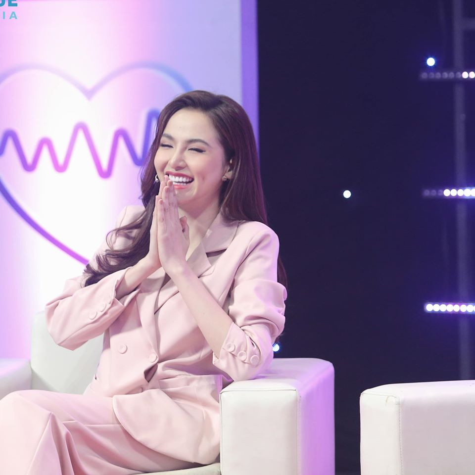 Hoa hậu Diễm Hương dịu dàng, nền nã trong bộ vest tông màu hồng pastel trên truyền hình.