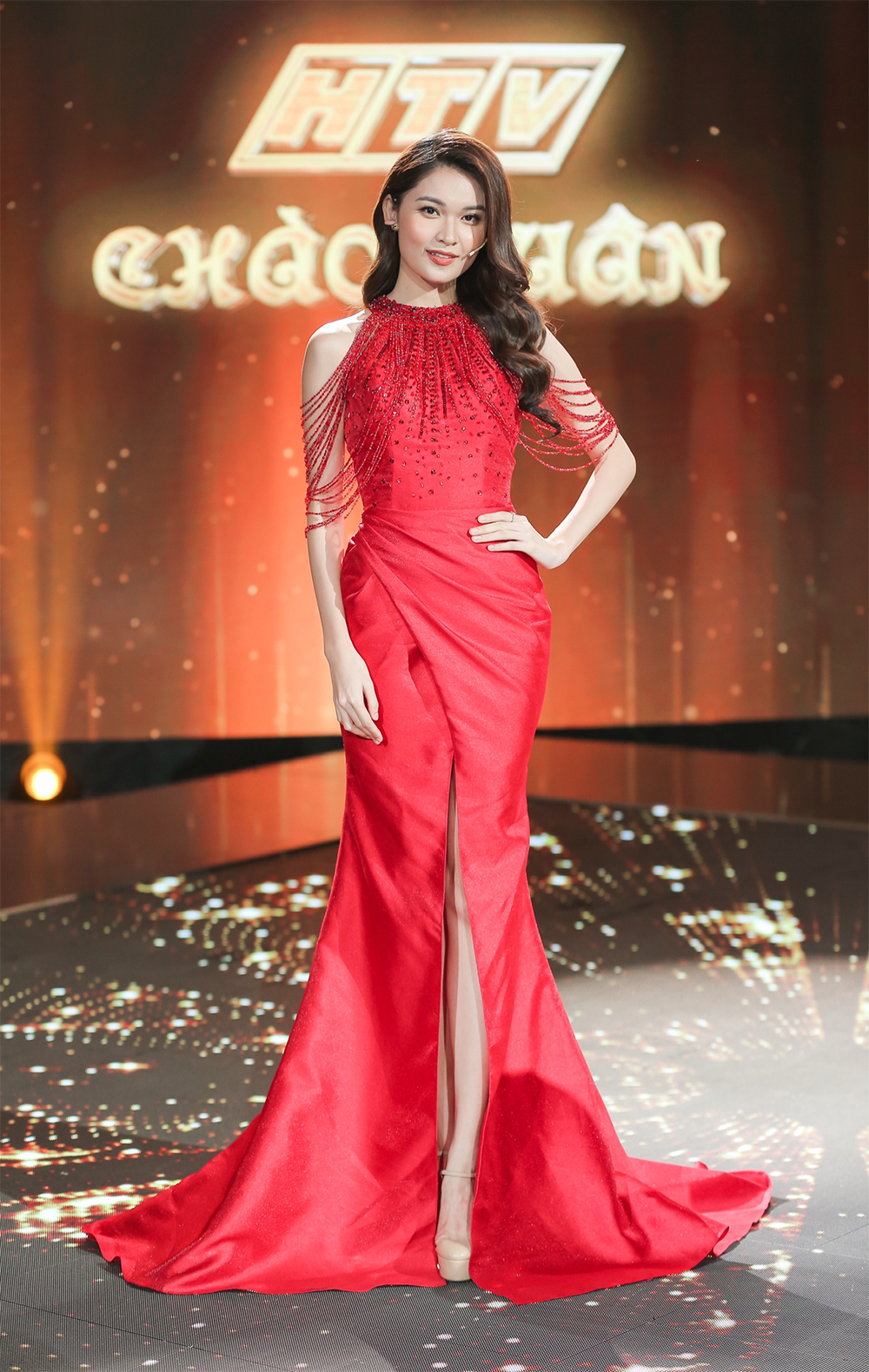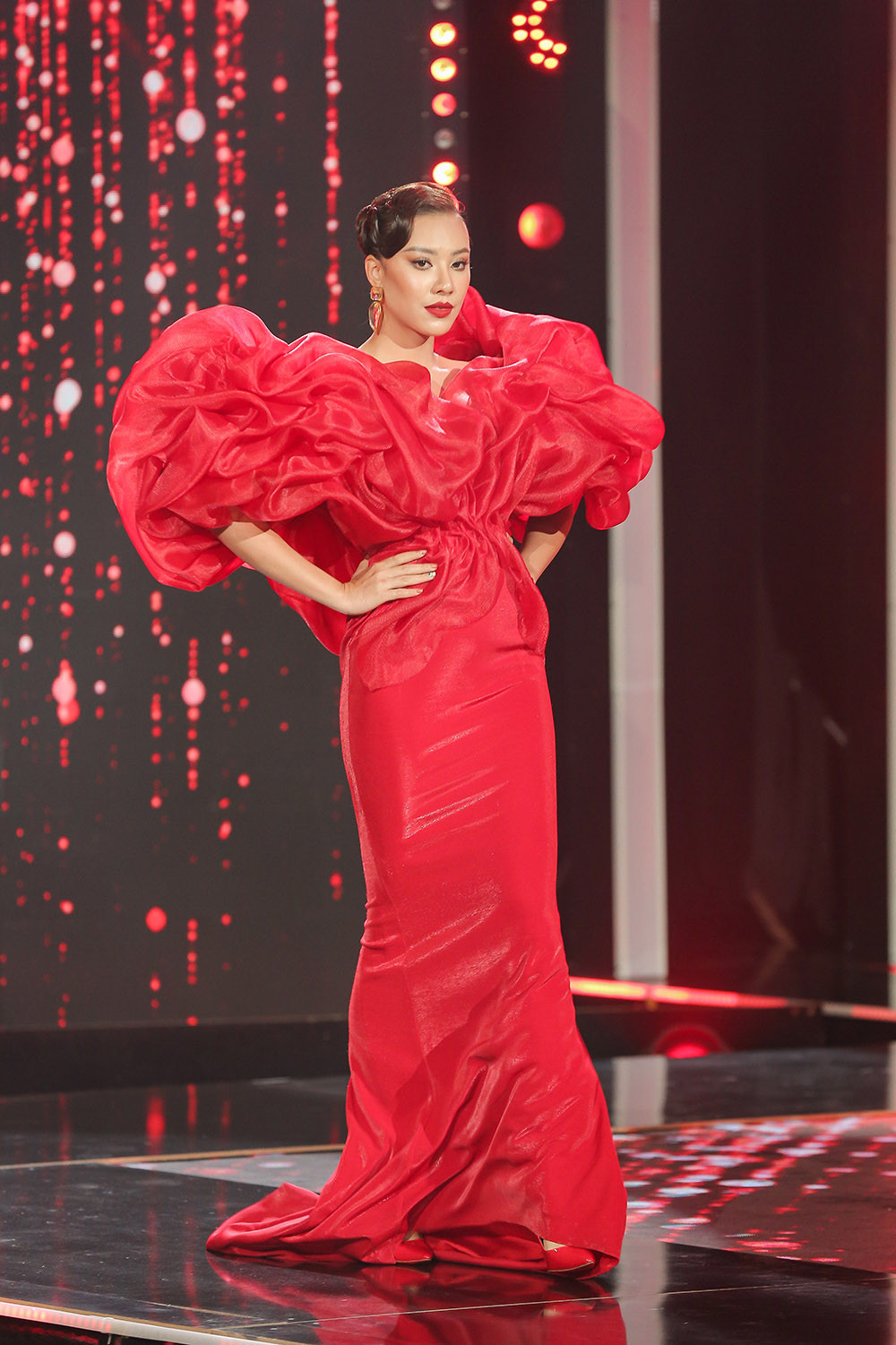 Á hậu Kim Duyên trình diễn thời trang trong chương trình. Cô diện bộ váy đỏ rực, thiết kế cầu kỳ.