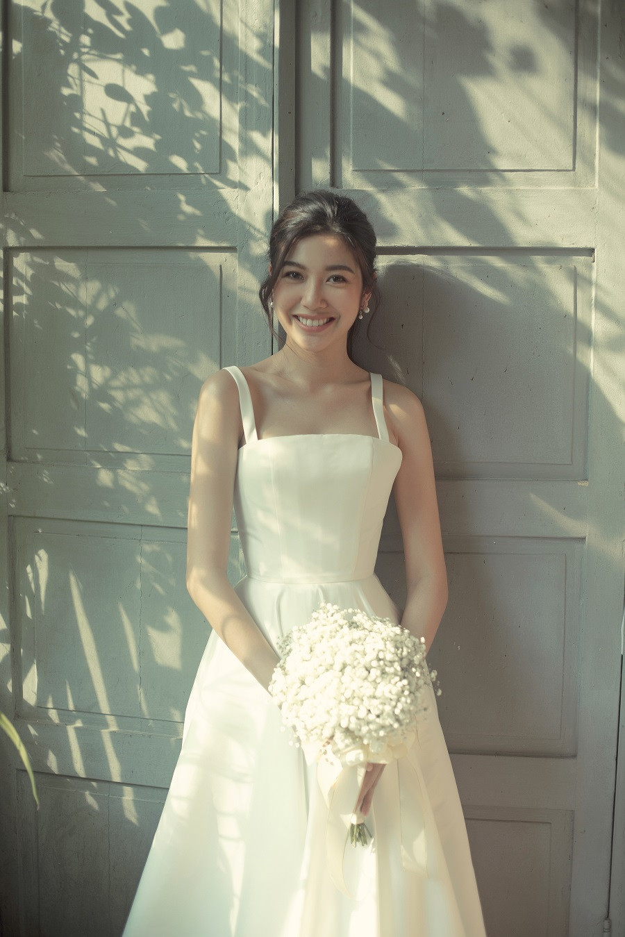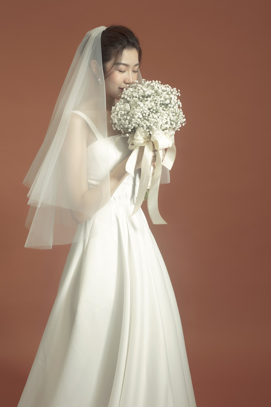 Tuy nhiên, khi kết hợp cùng hoa trắng và khăn voan, người đẹp vẫn nở nụ cười hạnh phúc.