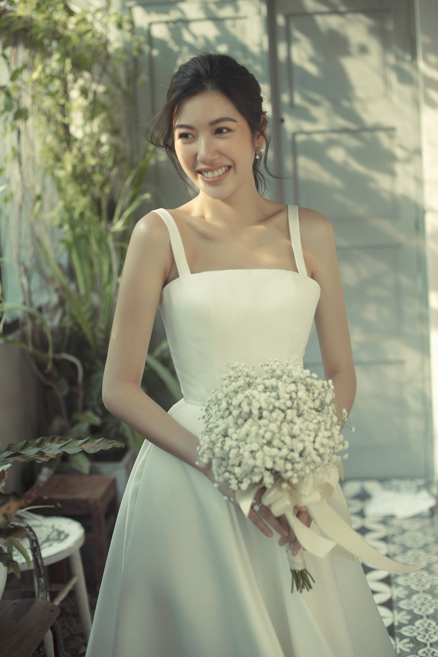 Thuý Vân lựa chọn kiểu váy xòe nữ tính, thiết kế đơn giản nhằm tôn lên sự thanh lịch, sang trọng.