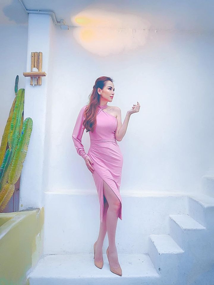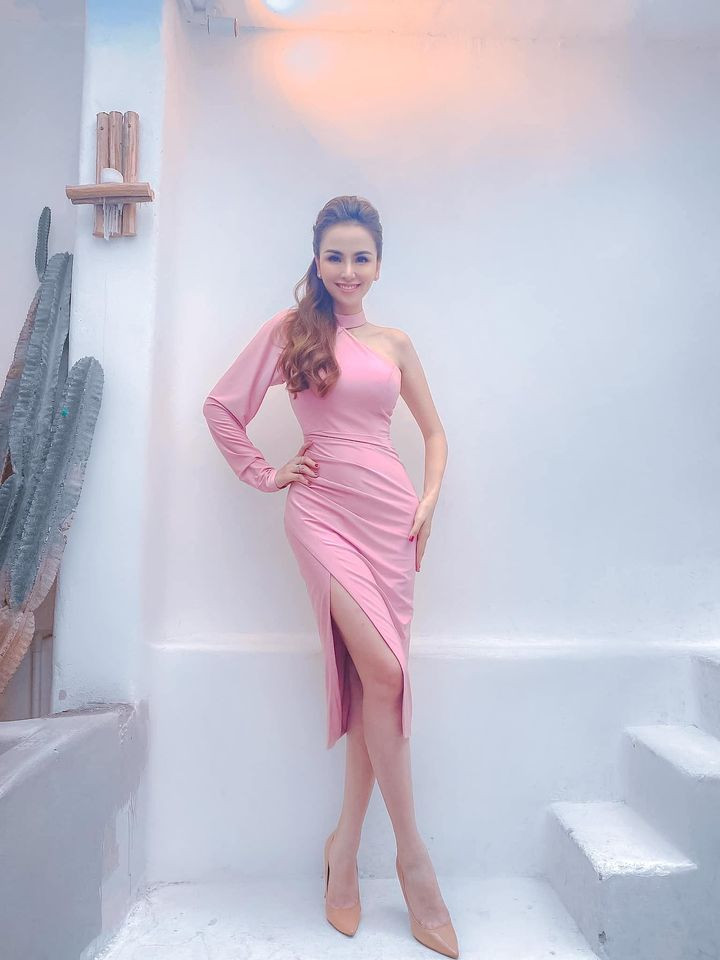 Hoa hậu Diễm Hương khoe đường cong quyến rũ trong bộ váy màu hồng bó sát.
