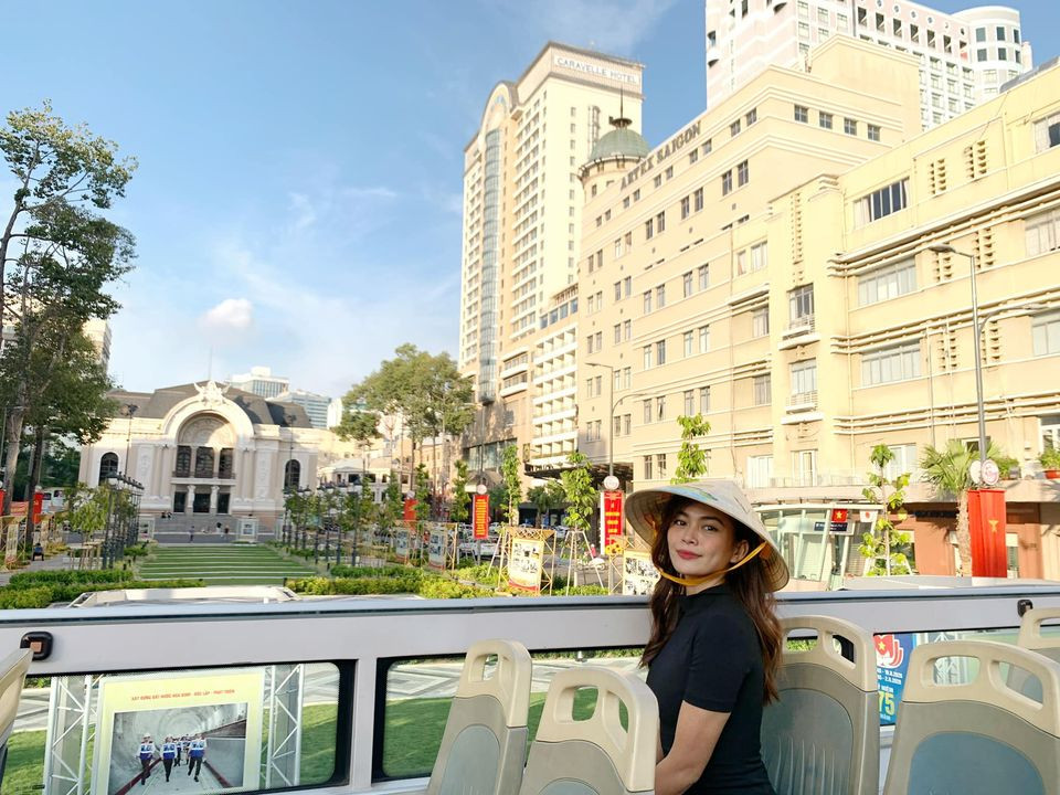 Á hậu Mâu Thuỷ trải nghiệm ngắm toàn cảnh TP. HCM từ xe bus hai tầng.