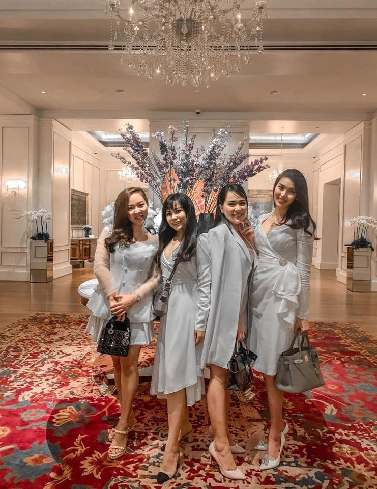 Hoa khôi Lan Khuê và hội bạn thân 'lên đồ' ton-sur-ton khi đi dự tiệc.