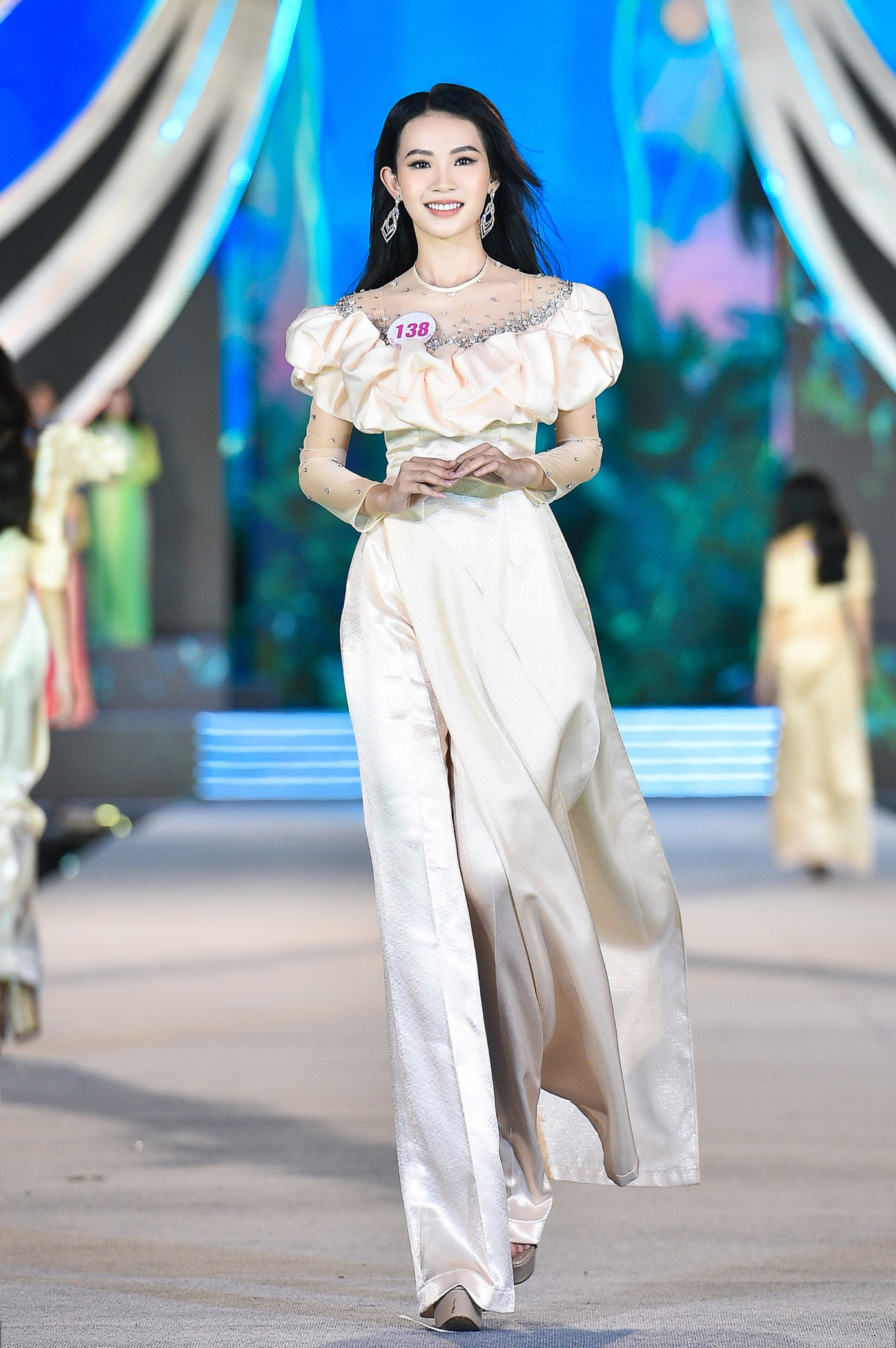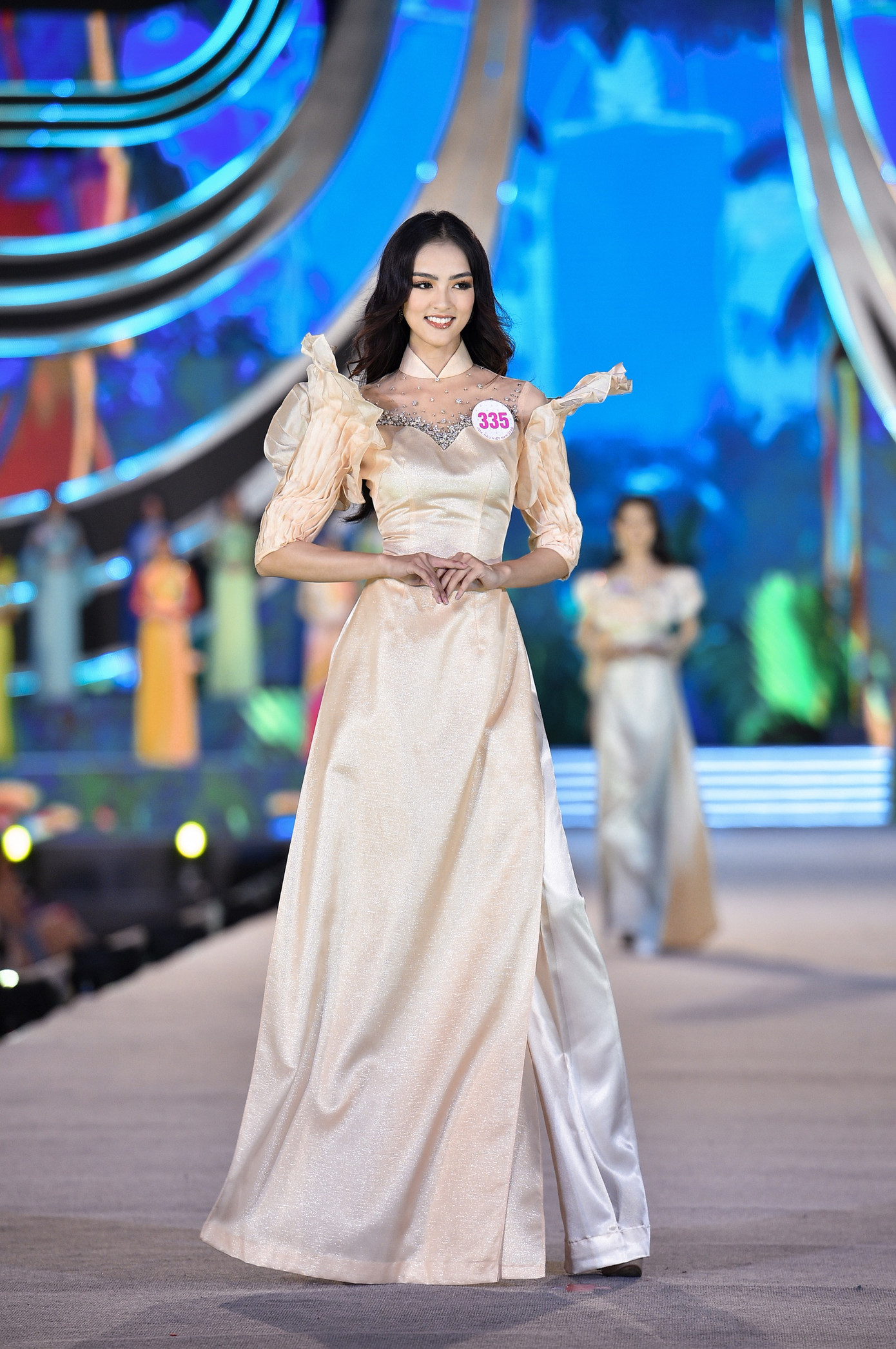 Hoà quyện với khung cảnh vô cùng lãng mãn và nên thơ tại sân khấu lúc này, từng làn gió biển như đang nâng bước chân của các thí sinh Hoa Hậu Việt Nam 2020 trên sân khấu, kết hợp với những thiết kế áo dài cách tân hiện đại vô cùng ấn tượng đến từ BST áo dài của NTK Ngô Nhật Huy. Các cô gái đêm nay được thiên nhiên ưu ái với tiết trời trong lành, điều đã giúp họ thêm phần lộng lẫy khi khoe sắc trong những bộ aó dài thể hiện cá tính riêng của mình.