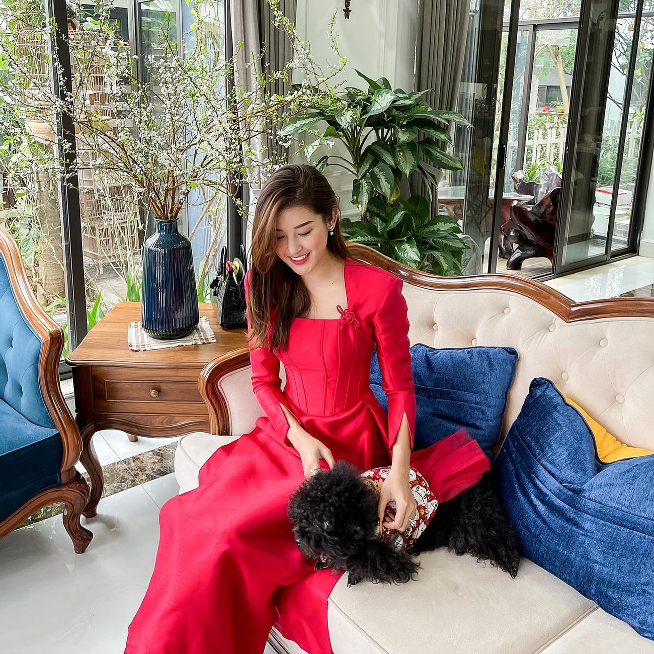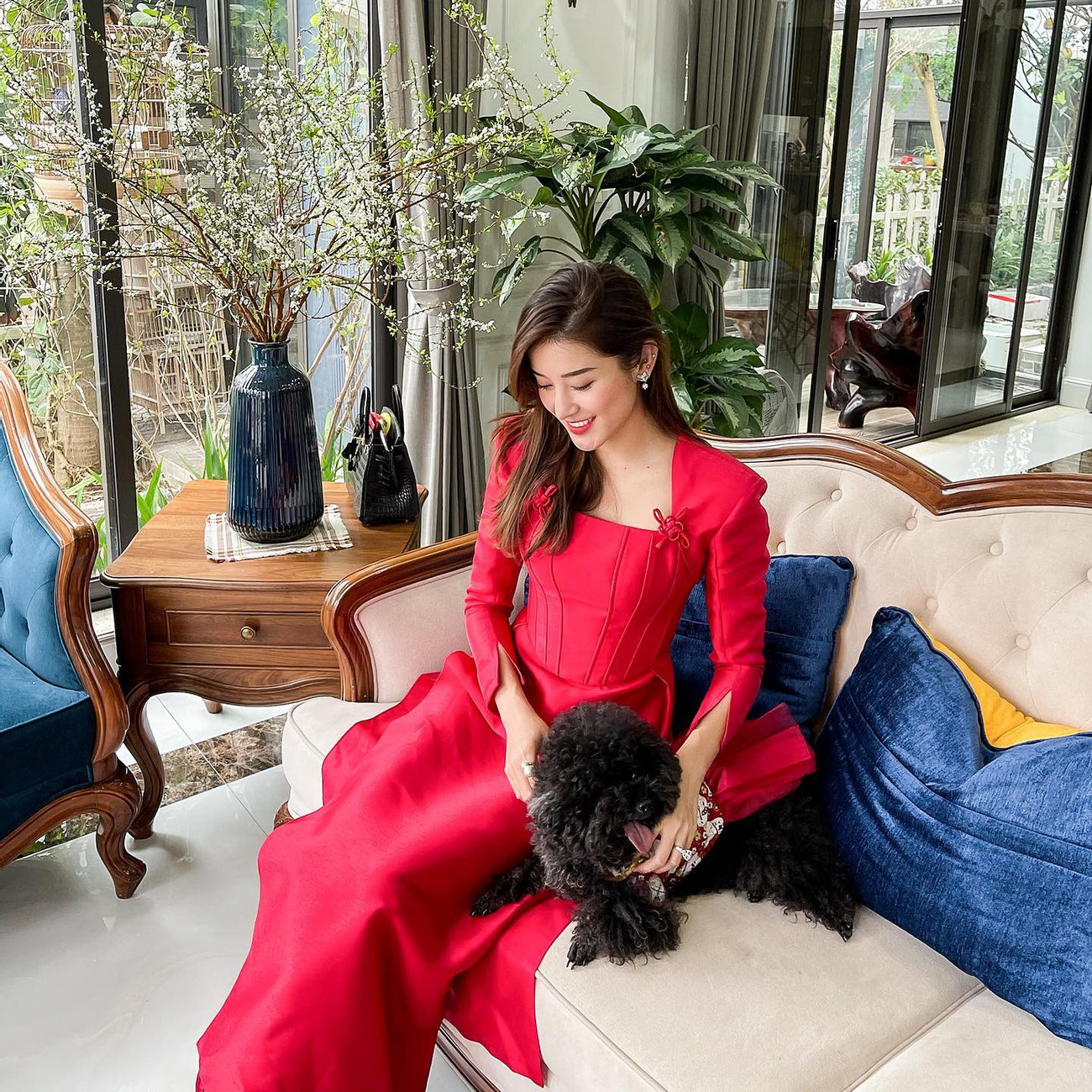 Á hậu Huyền My diện áo dài đỏ, đưa chú cún cưng đi chơi vào ngày mùng 1 Tết.