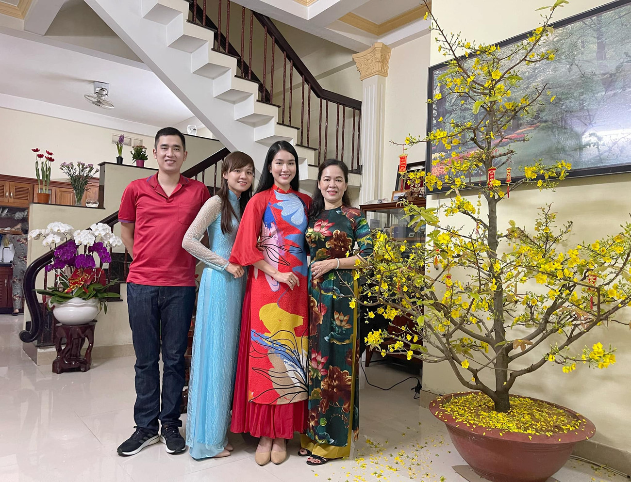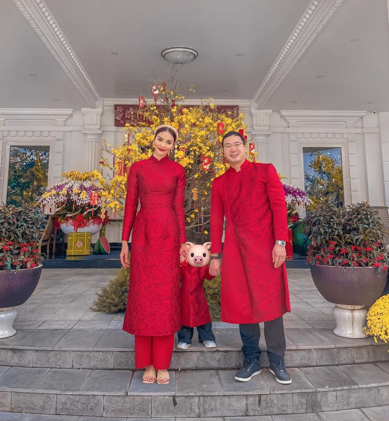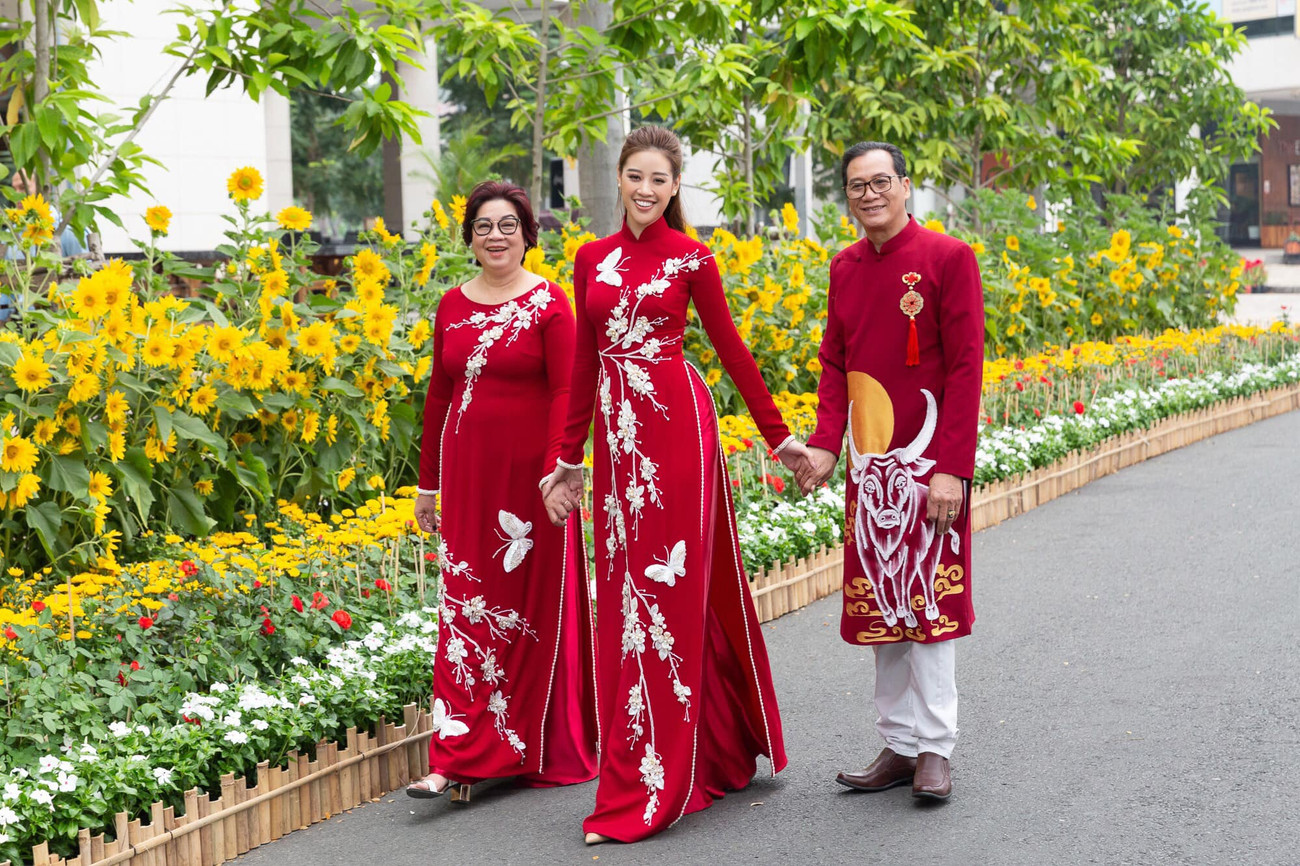 Hoa hậu Khánh Vân cùng cả nhà diện áo dài đỏ rực rỡ đi du Xuân.