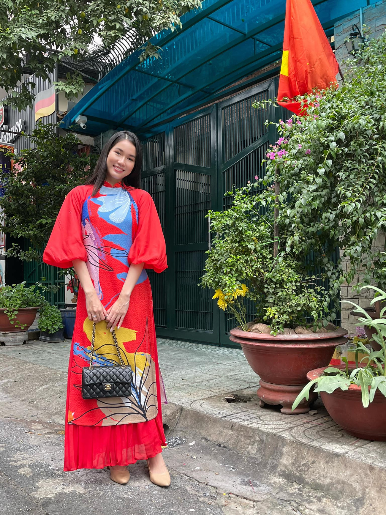 Hoa khôi Lan Khuê hoá thành mỹ nhân xưa với bộ áo dài đỏ rực hoạ tiết vô cùng đẹp mắt kết hợp cùng phụ kiện hàng hiệu.
