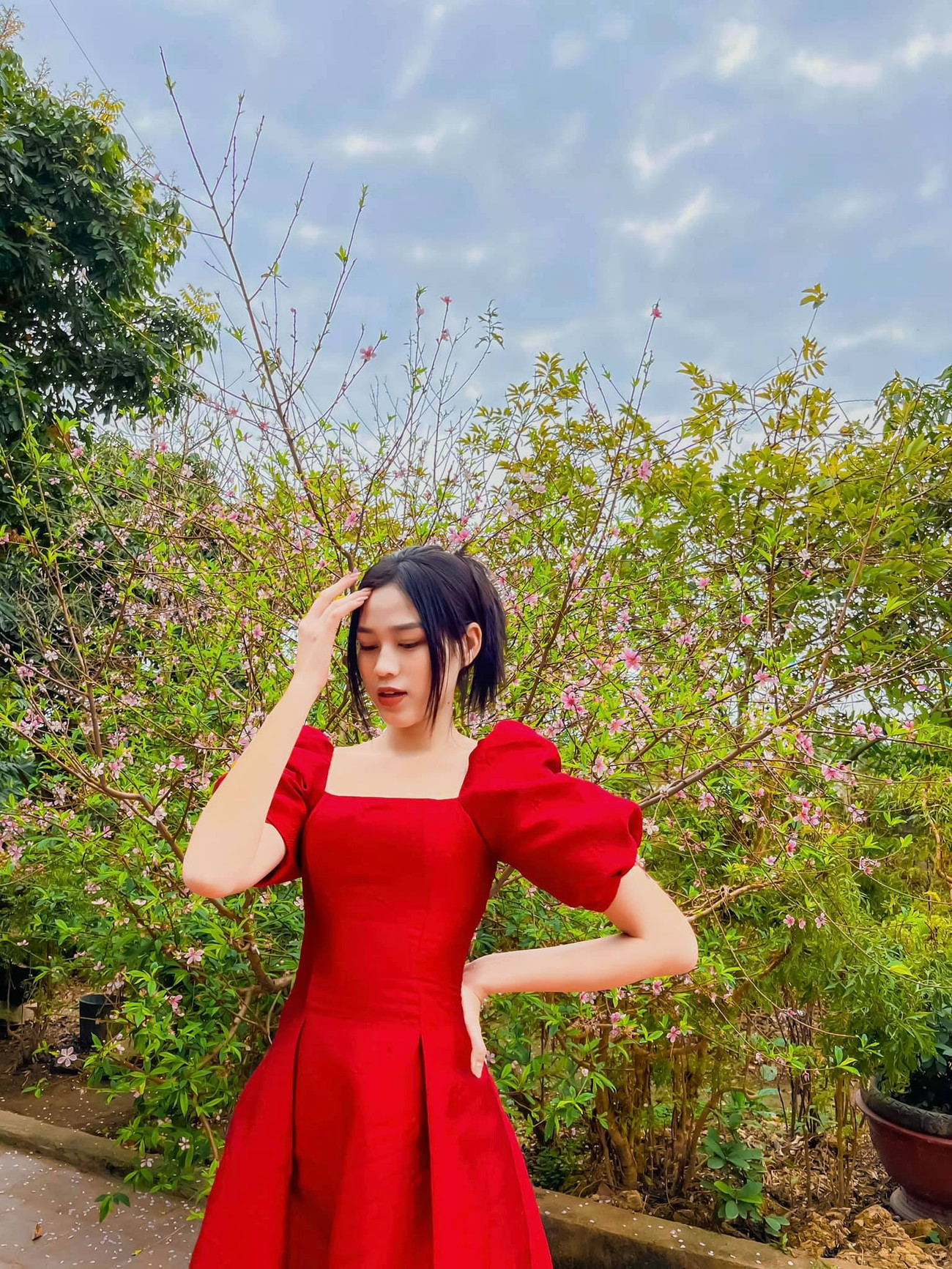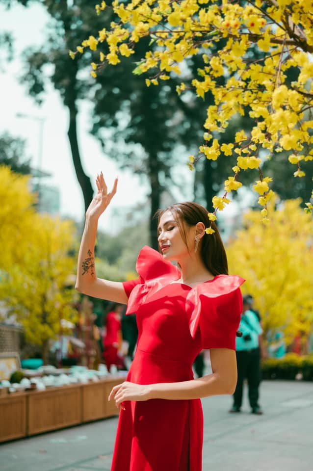 Võ Hoàng Yến dịu dàng trên đường hoa ngày Xuân trong tà áo dài cách điệu màu đỏ duyên dáng.