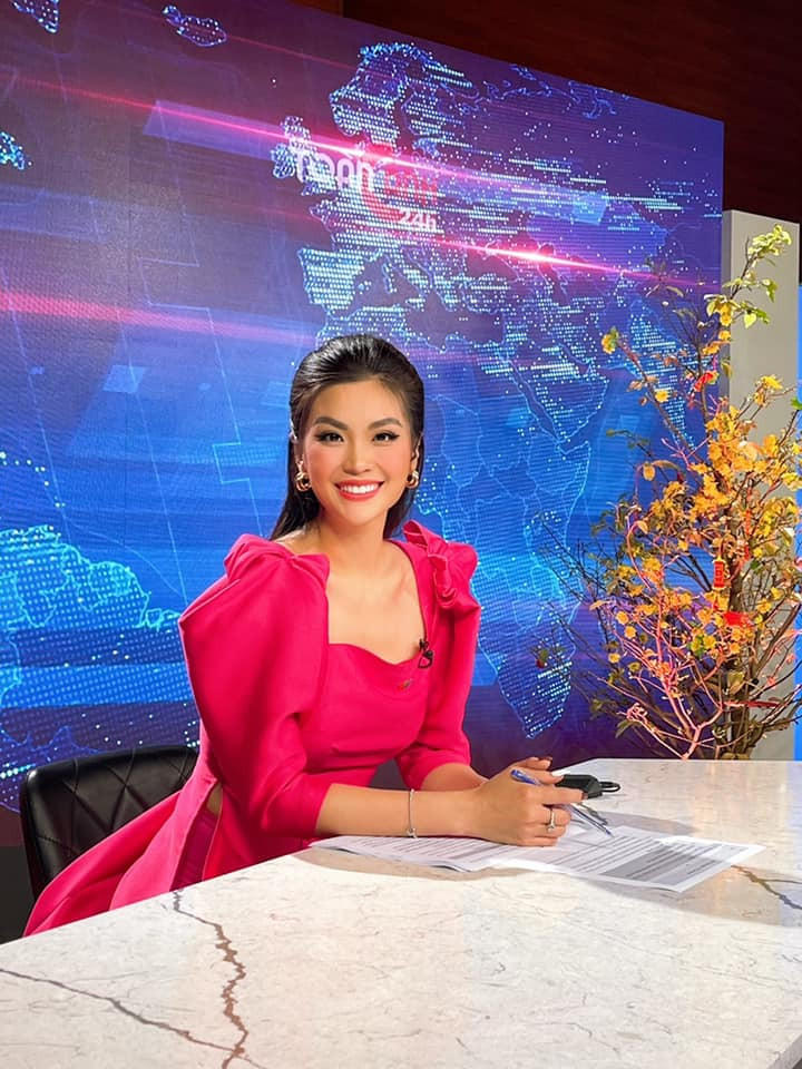 Trong số lên sóng đầu tiên ngày đầu năm mới 2021 của Bản tin toàn cảnh 24h, Á hậu Diễm Trang lựa chọn bộ áo dài đỏ rực kiểu dáng tay phồng đẹp mắt.