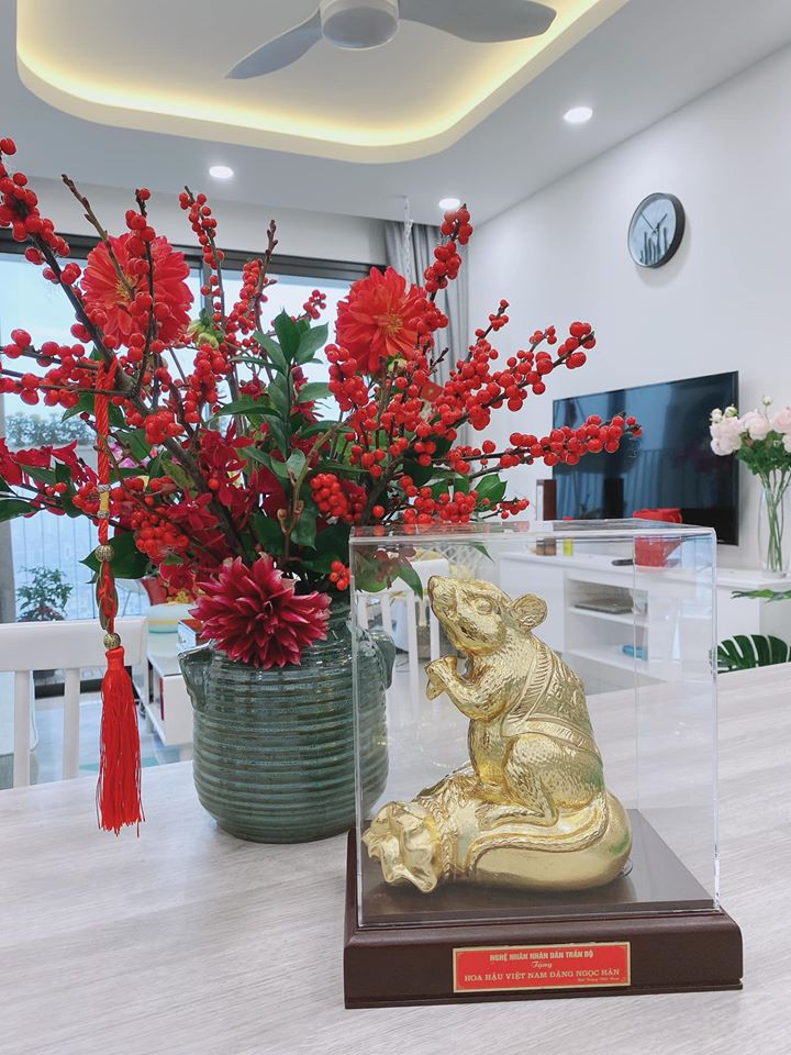 Bên trong căn hộ của Hoa hậu Ngọc Hân là bình đào đông đỏ rực, hứa hẹn một năm nhiều may mắn. Cô còn được tặng một chút chuột vàng đầy ấn tượng và độc đáo.
