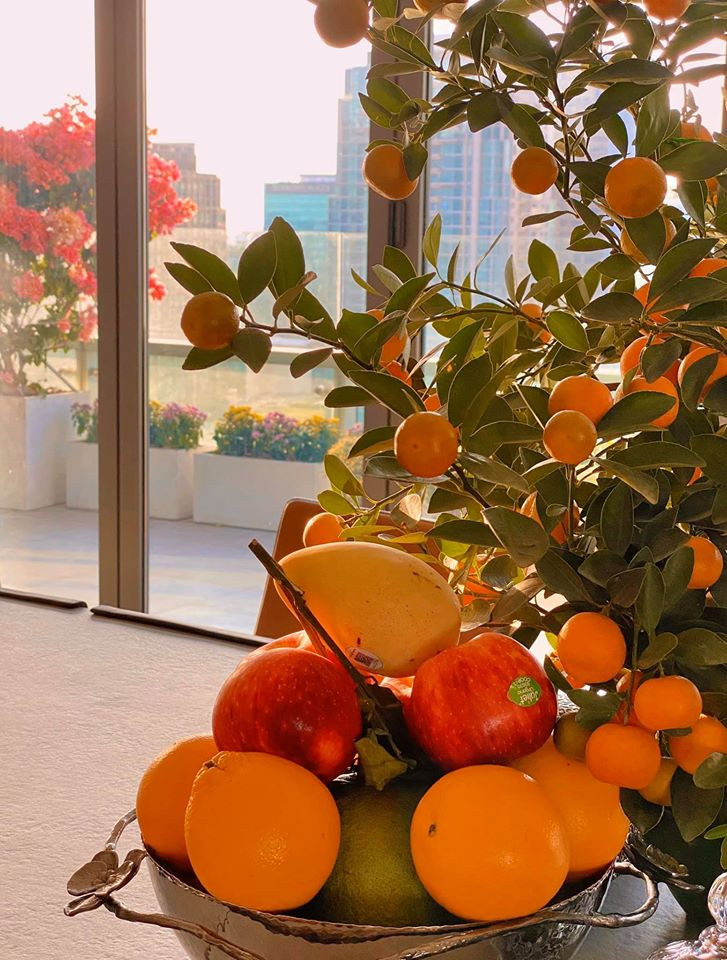 Mâm ngũ quả cùng cây quất sai trĩu nặng cũng được Thu Thảo trưng bày trong nhà.