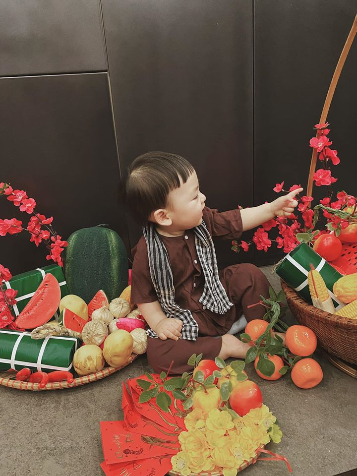 Con trai Tú Anh rất thích thú khi được tạo dáng chụp ảnh cùng những vật dụng ngày Tết.