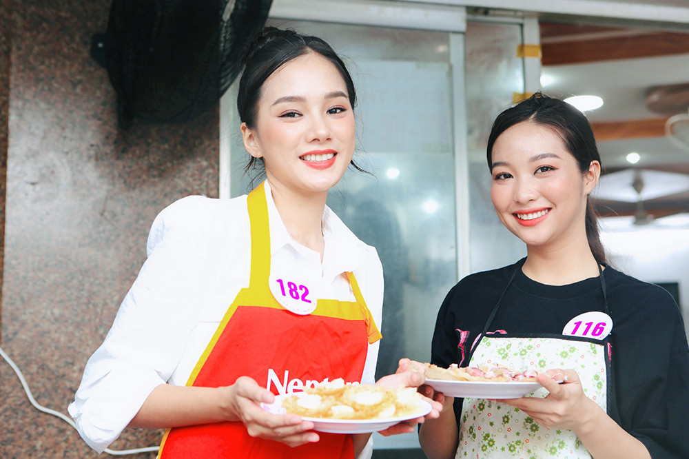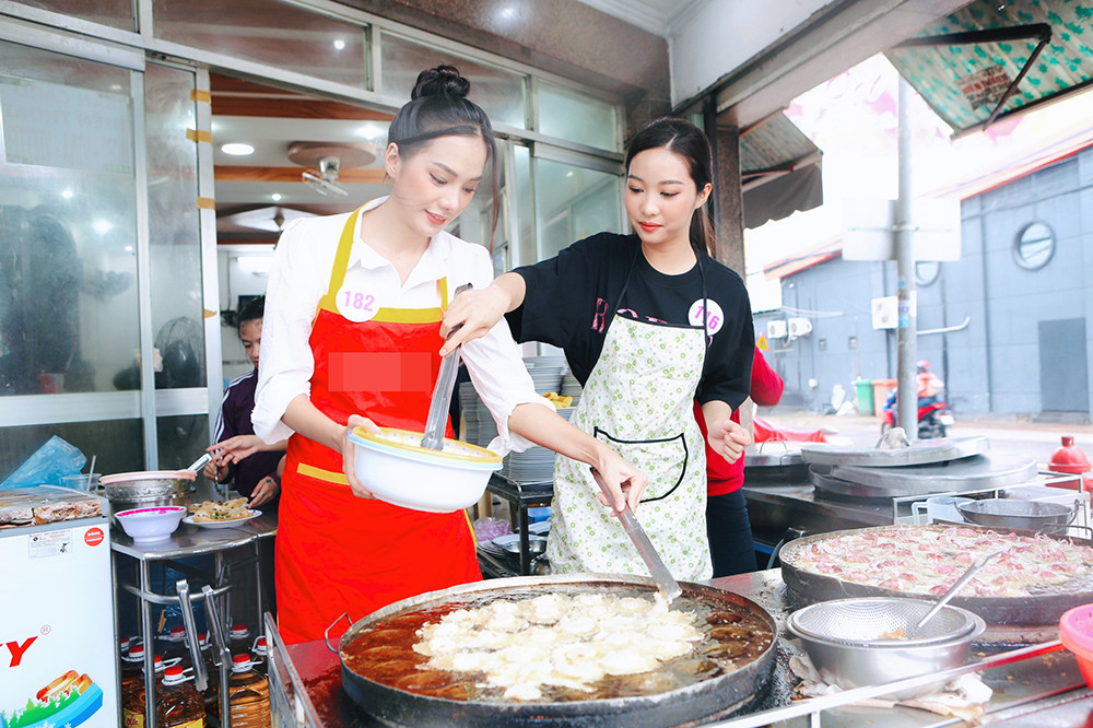 Các cô gái đã được trực tiếp vào bếp để tìm hiểu cách chễ biến món bánh khọt nổi tiếng.