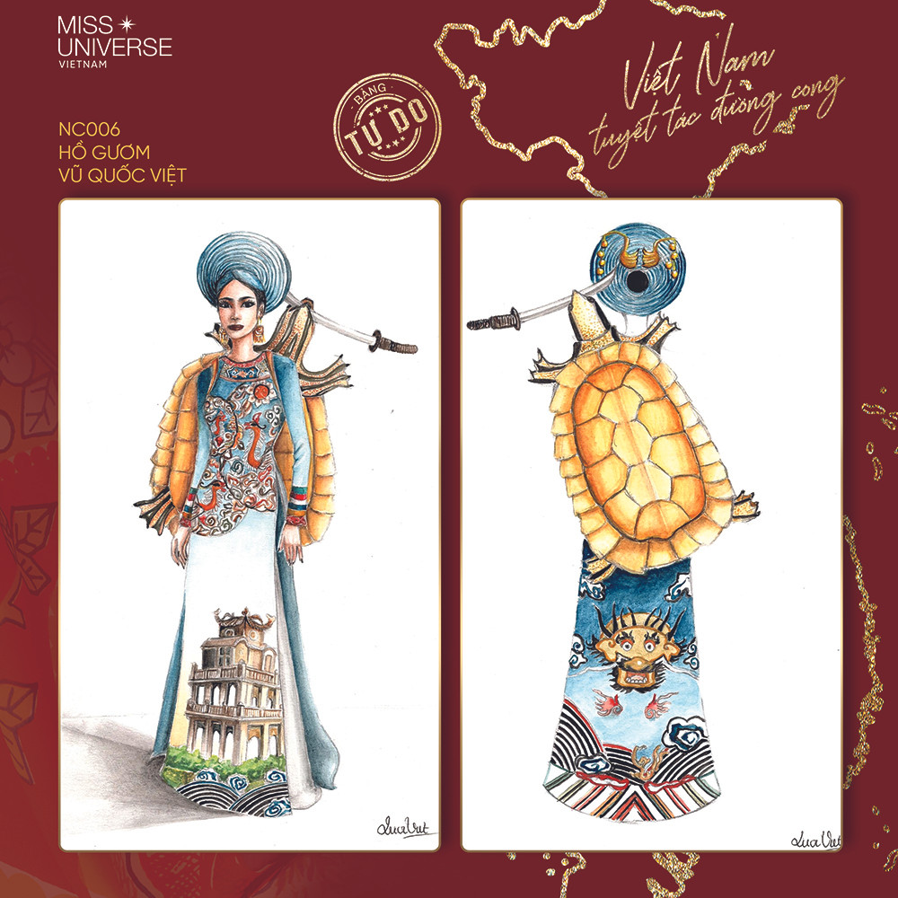 Bộ trang phục “Hồ Gươm” của Vũ Quốc Việt lấy ý tưởng từ sự tích Hồ Gơm, với thiết kế này người xem có thể liên tưởng được cốt truyện, bởi sự nổi bật của Rùa Vàng và Hồ Gươm cùng với những họa tiết trên chiếc áo dài không đối xứng với nhau, cùng với màu sắc, khiến bộ trang phục trở nên tình cảm hơn. Bài thi này đề cao yếu tố văn hóa lịch sử.