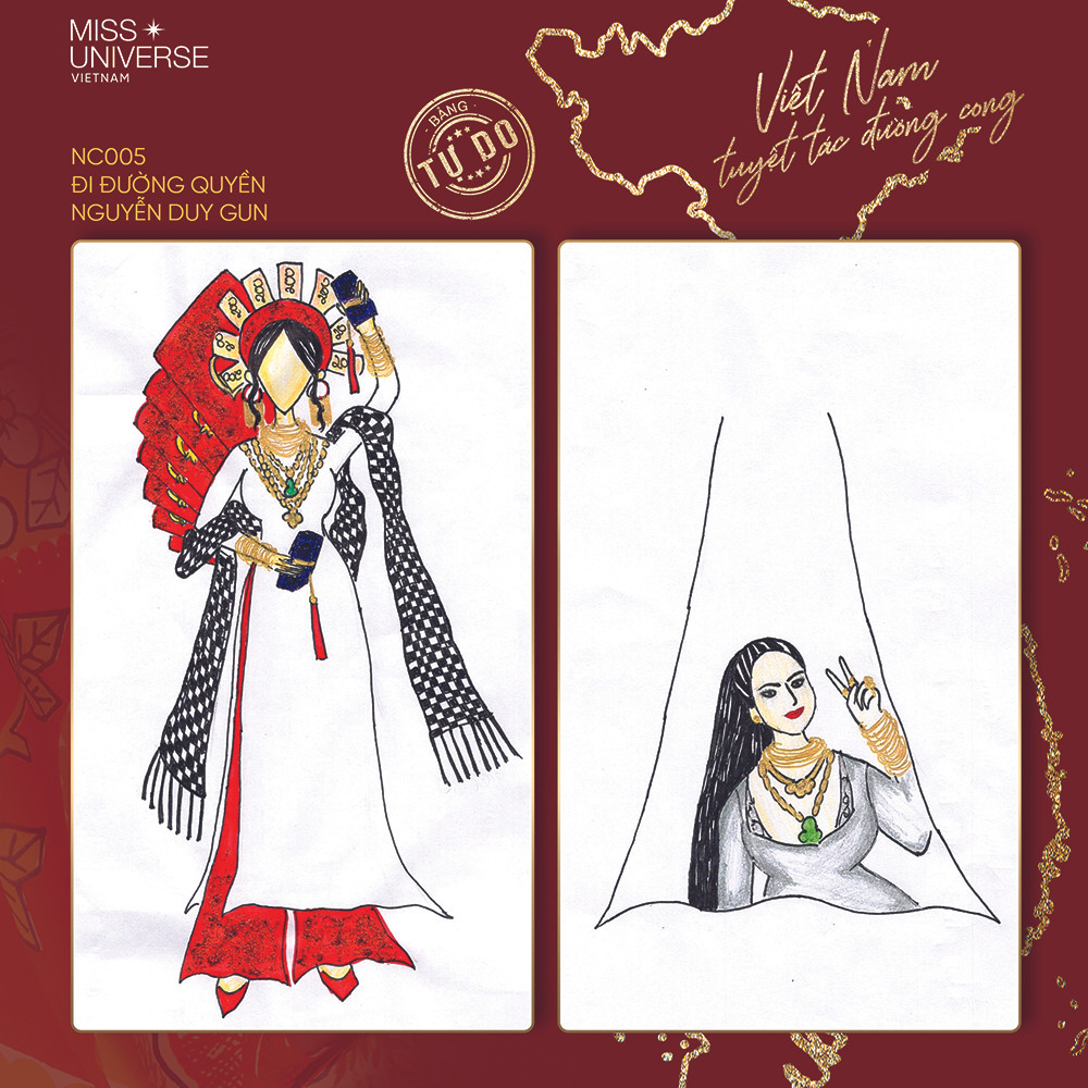 Lấy cảm hứng từ tà áo dài truyền thống Việt Nam kết hợp với múa quyền, đi đường quyền hay còn gọi là đường lang quyền, “Đi đường quyền” của Nguyễn Duy Gun là một bài thi thú vị bắt theo trend hiện nay của giới trẻ. Vàng đeo trên tay, trên cổ thể hiện sự giàu có, đẹp đẻ, và đúng chất miền Tây Việt Nam. Đồng thời hình ảnh 7 quyển sổ đất đại diện cho sự cần cù, đó là thành quả của con người mới có được và số 7 cũng là số may mắn trong tâm thức con người. Tà sau, hình ảnh của cô Minh Hiếu (một nhân vật đang nổi tiếng trên mạng xã hội) vừa hiền lành vừa đại diện cho cái lương thiện luôn giúp đỡ mọi người vượt qua các khó khăn trong cuộc sống. Ngoài ra, chất liệu để làm nên bộ áo dài này là lụa Nam Vang, thể hiện sự sang trọng, tinh tế toát nên nét đẹp dịu dàng, thanh nhã.