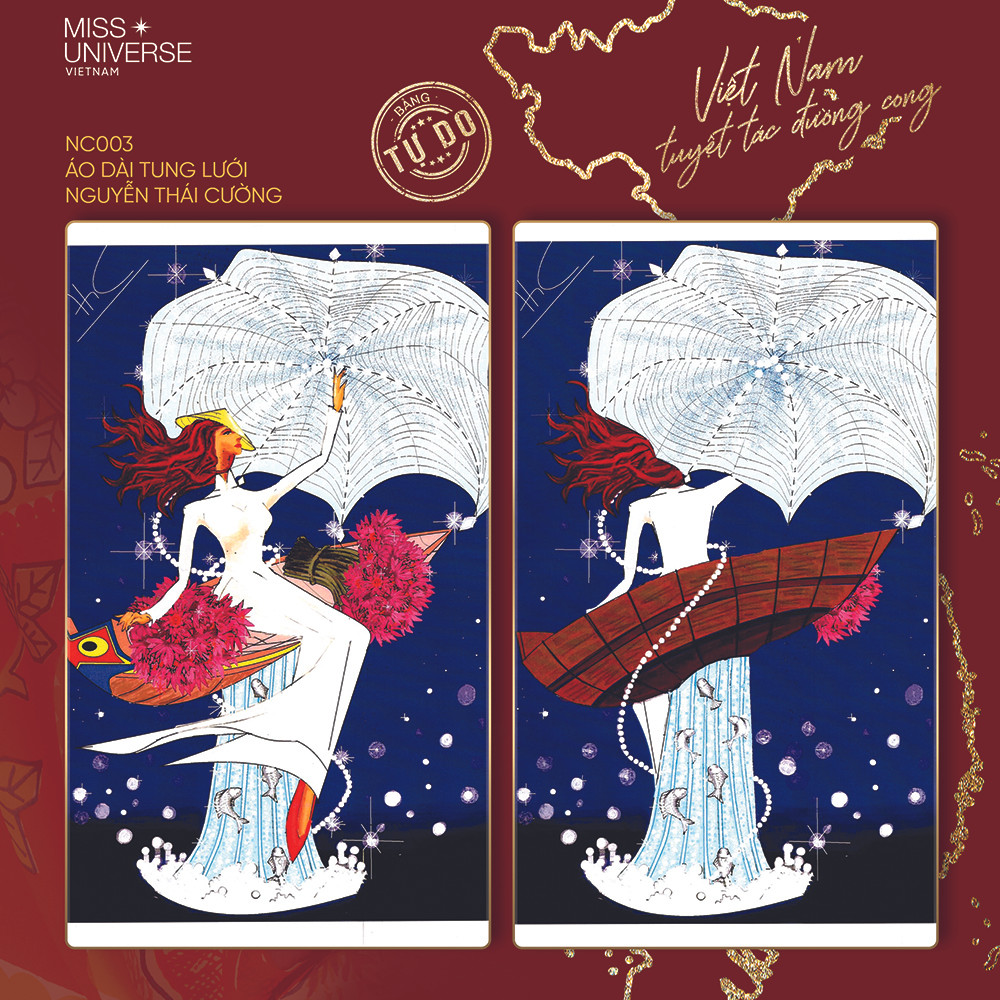 “Áo dài tung lưới” của Nguyễn Thái Cường lấy ý tưởng từ văn hóa bắt cá mùa nước nổi ở miền Tây Nam Bộ. Bộ trang phục được thiết kế với phần trung tâm là cô gái mặc áo dài trắng gồm phần trên là người thật còn phần dưới là hình nhân. Phần chân thật của người mặc giấu dưới chiếc váy hình cuộn nước bên dưới. Cuộn nước nâng trên mình chiếc ghe chở đầy hoa súng, bên dưới là đàn cá bạc tung tăng. Khi trình diễn, người mặc sẽ thể hiện động tác văng lưới, thể hiện hình ảnh hùng vĩ của thiên nhiên và con người, trong đó con người chế ngự và khai thác thiên nhiên.