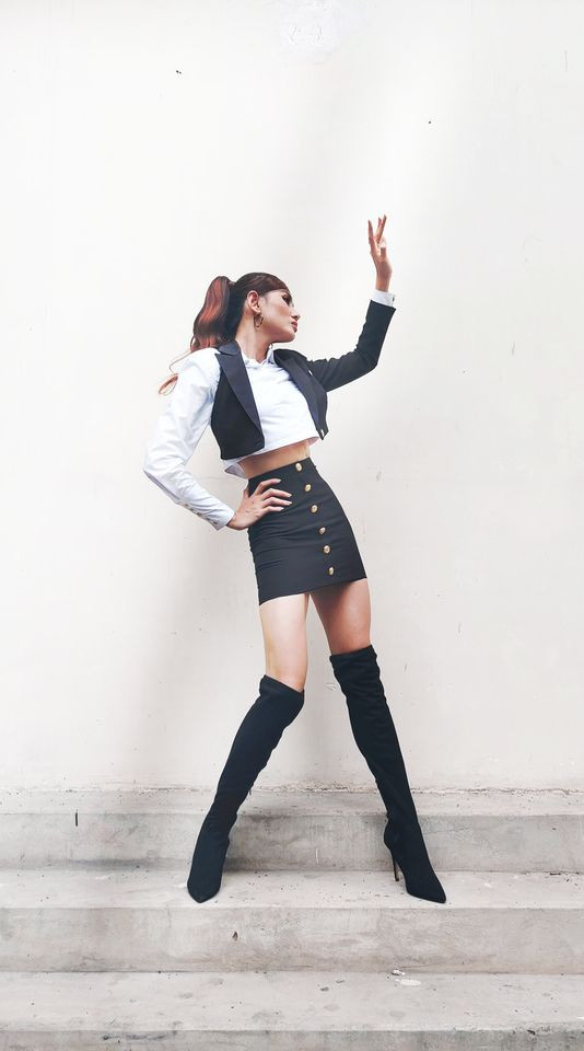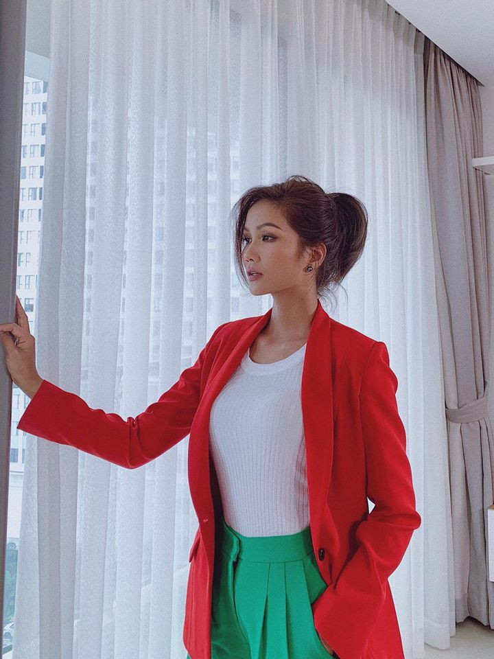 Hoa hậu H'Hen Niê khoe dáng trong bộ đồ theo phong cách color-block.