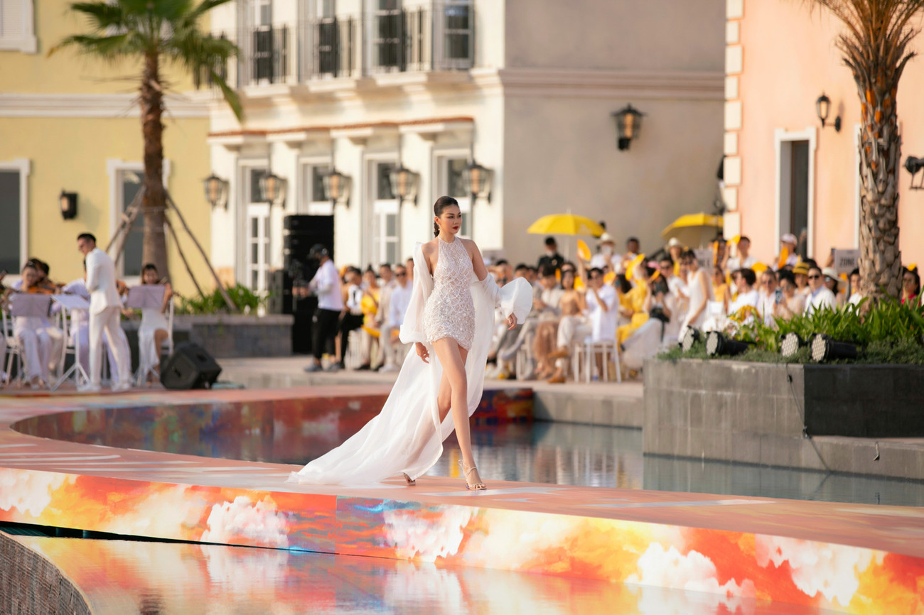 Chiều 20/3, Hoa hậu Lương Thuỳ Linh đảm nhận vai trò mở màn cho show diễn của NTK Lê Thanh Hoà tại Phú Quốc.