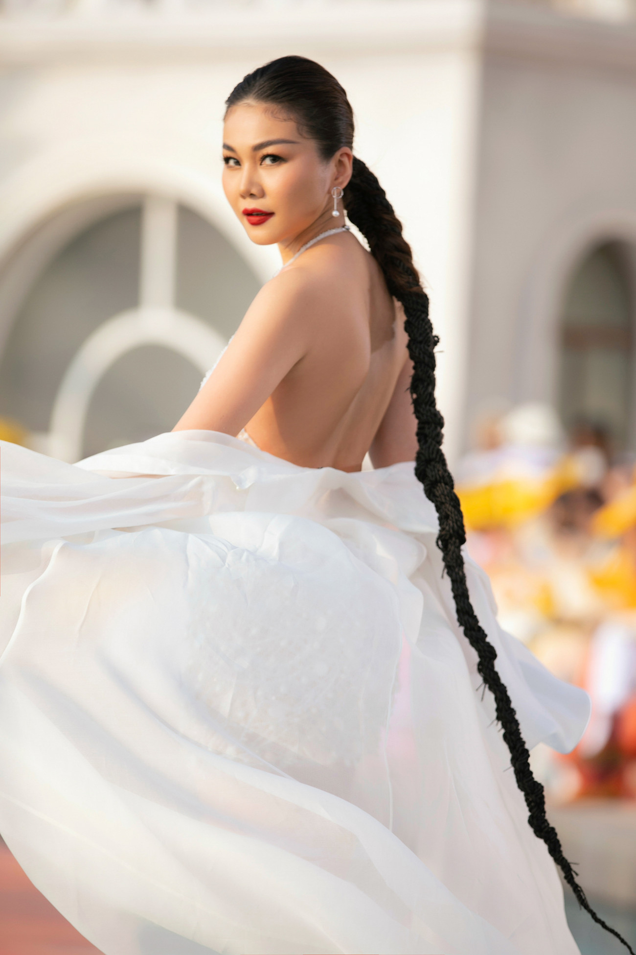 Cô diện bộ váy đỏ rực làm từ chất liệu voan bay bổng và lãng mạn.