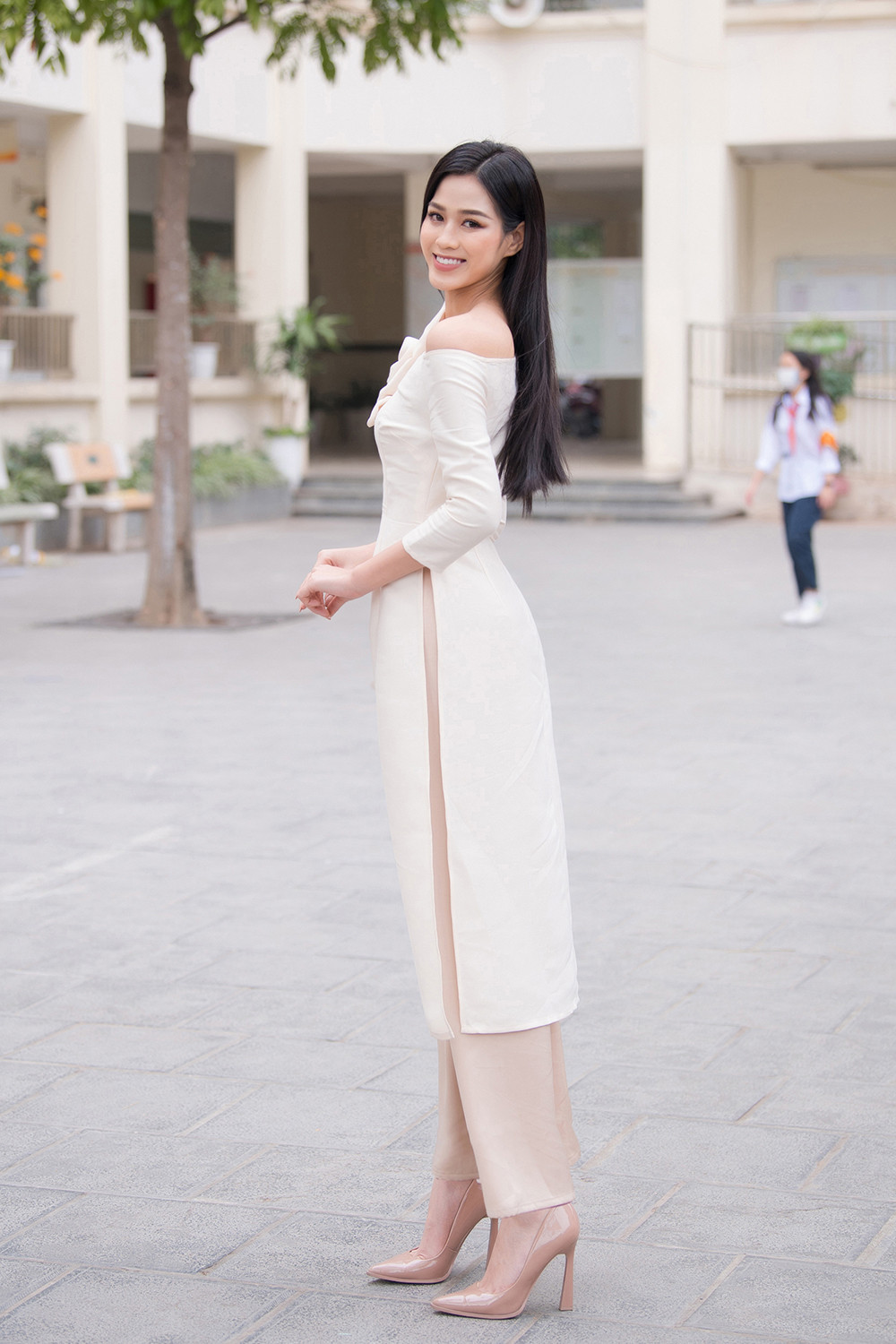 Bộ áo dài lệch vai với điểm nhấn là bông hoa to trước ngực giúp Đỗ Thị Hà khoe vẻ nền nã nhưng không kém phần quyến rũ.