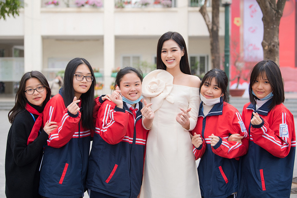 Hoa hậu Đỗ Thị Hà rạng rỡ bên các em học sinh ở sự kiện.