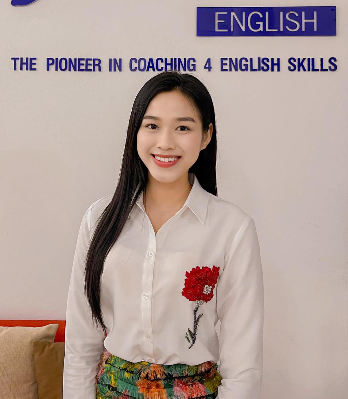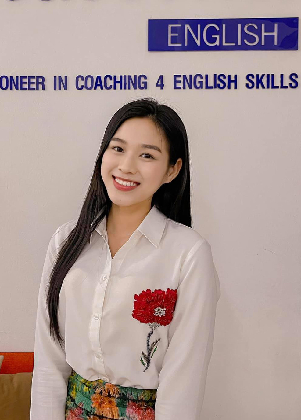 Hoa hậu Đỗ Thị Hà mặc áo sơ-mi trắng với hoạ tiết thêu hoa giản dị khi tham dự sự kiện nhưng vẫn toát lên vẻ xinh đẹp, rạng ngời.