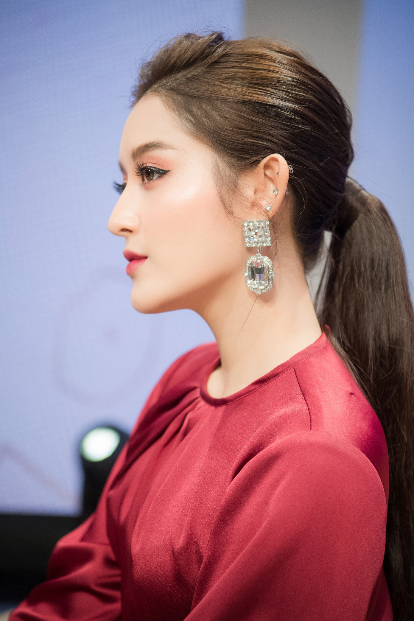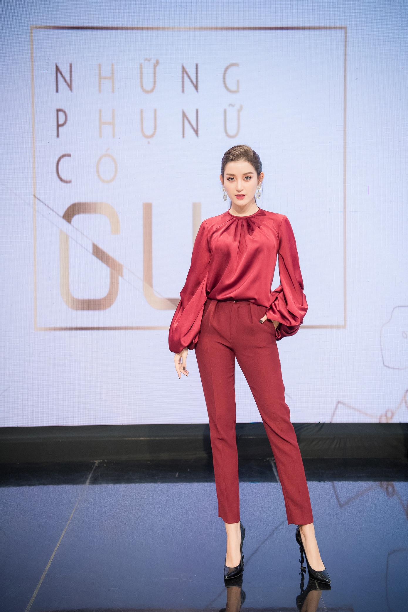 Tham dự event đầu tiên sau Tết trong tình hình dịch bệnh, Huyền My lựa chọn bộ trang phục kín đáo nhưng không kém phần nổi bật với tông màu đỏ rực rỡ của NTK Lê Thanh Hoà.