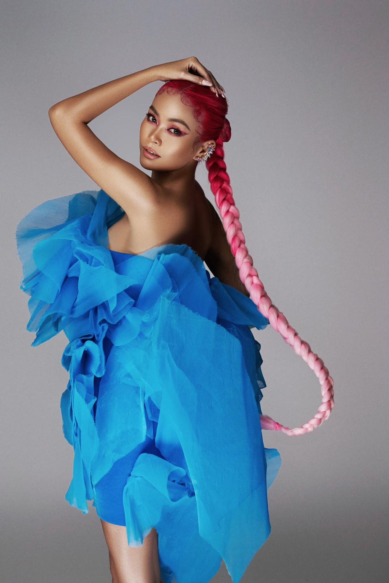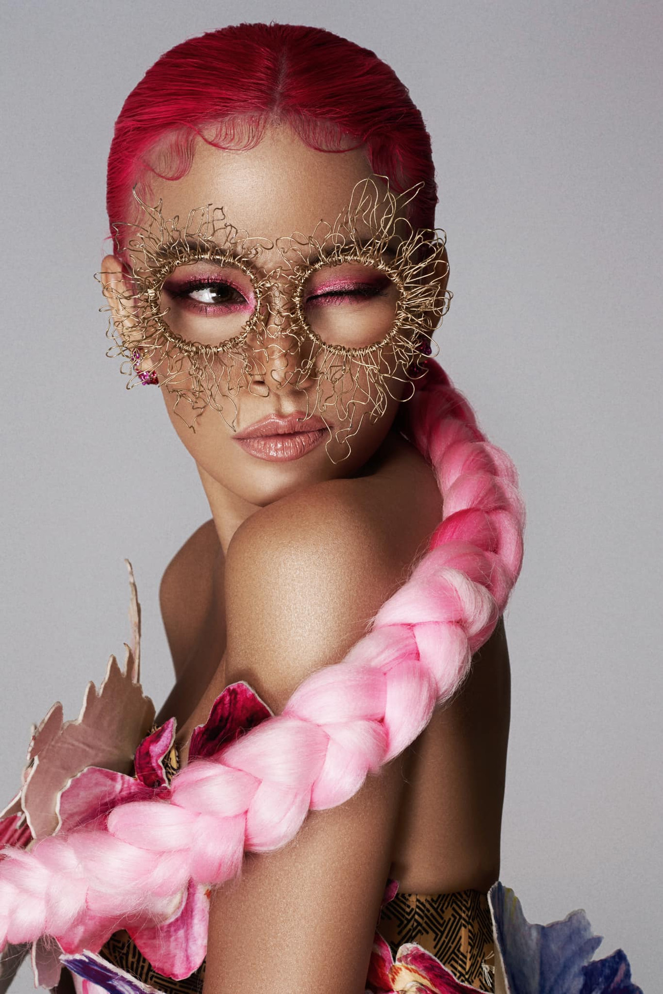 Á hậu Mâu Thủy hóa nữ thần nóng bỏng với tạo hình cầu kỳ. Điểm nhấn của người đẹp chính là mái tóc hồng rực rỡ.
