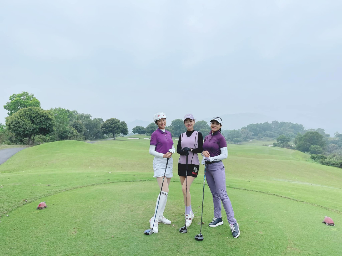Ngọc Hân, Jennifer Phạm, Thúy Hạnh cùng diện trang phục áo tím đồng điệu trên sân golf.