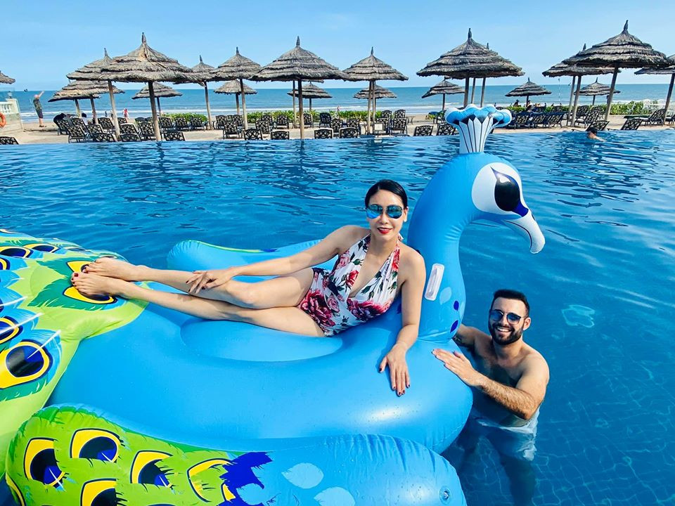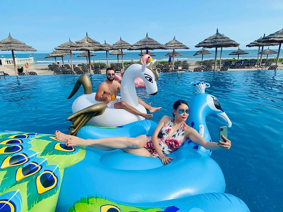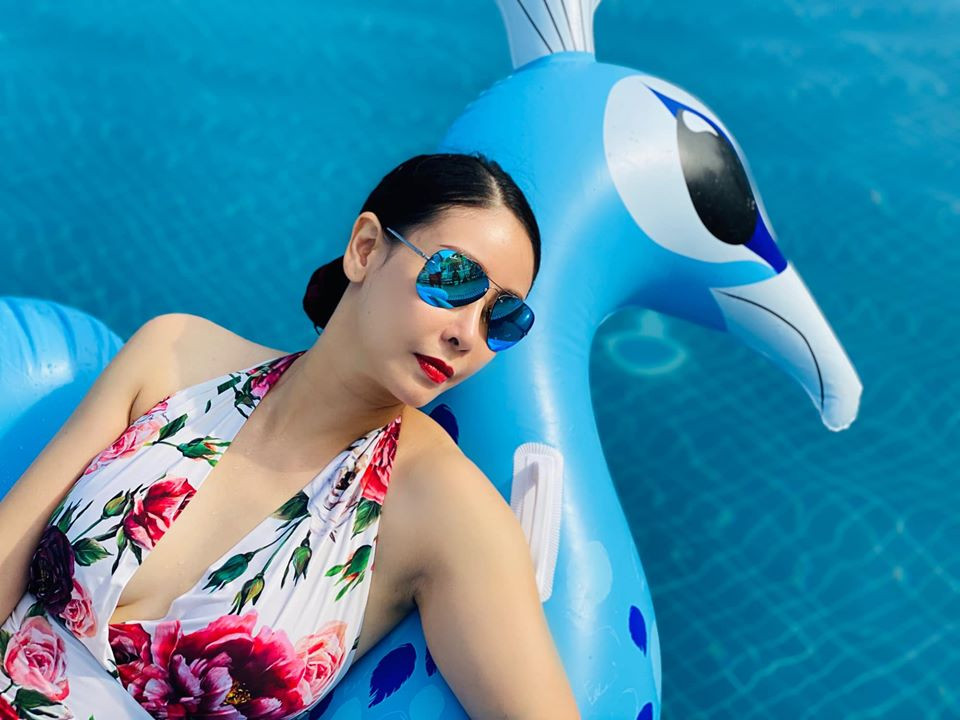 Hoa hậu Việt Nam 1992 diện trang phục áo tắm một mảnh hoạ tiết hoa rực rỡ, khoe dáng gợi cảm bên làn nước trong xanh.