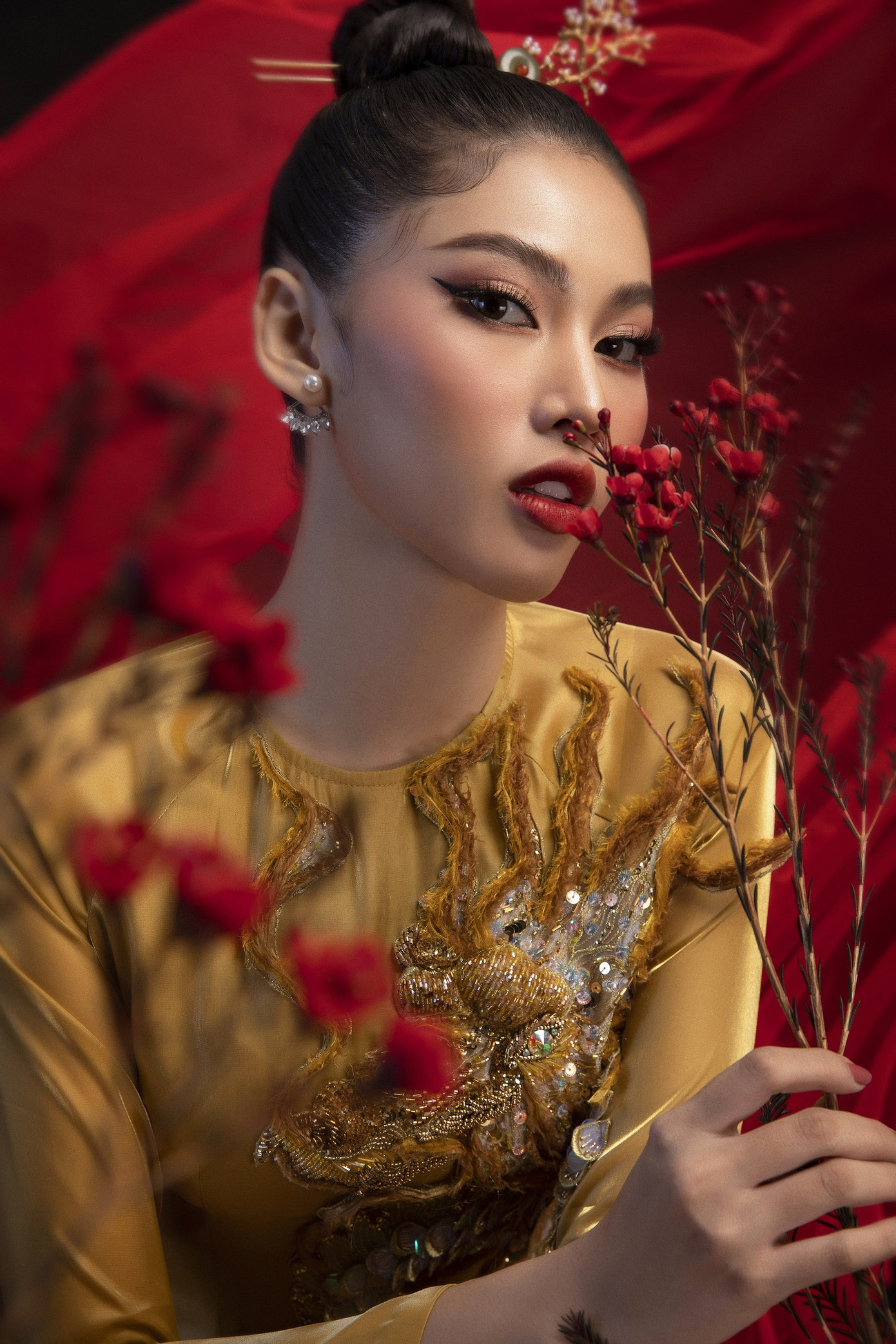 Nếu như loại cây này được đính kết toàn bộ bằng vàng ngọc, châu báu thì bộ quốc phục của Ngọc Thảo cũng không thể thiếu đi những chất liệu tương tự để tôn vinh vẻ đẹp cao quý của nàng Á hậu.