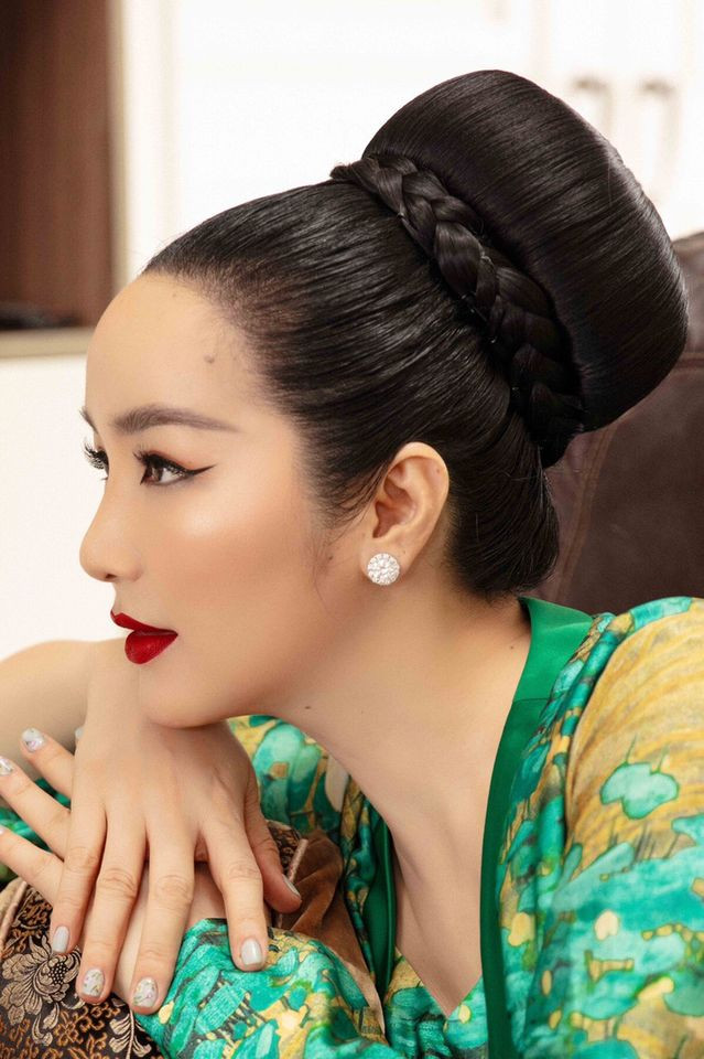 Hoa hậu Đền Hùng Giáng My khoe vẻ sang trọng và sắc sảo với kiểu tóc búi ấn tượng.