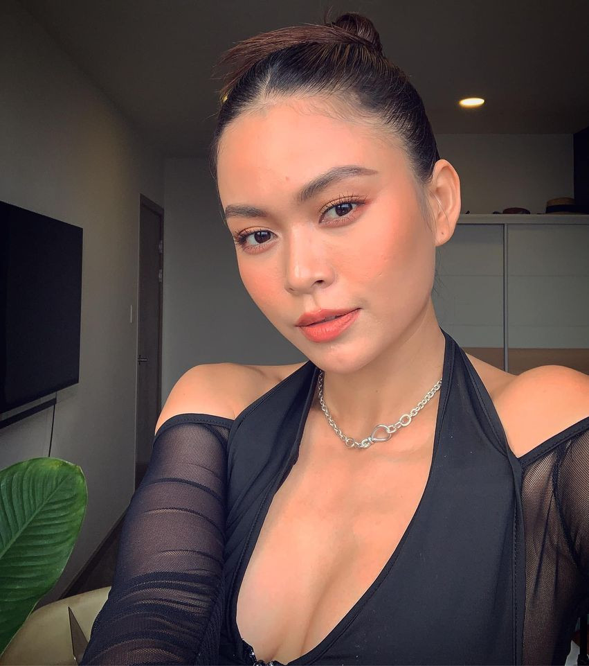 Á hậu Mâu Thuỷ cũng nóng bỏng không kém cạnh khi diện bộ váy màu đen chất liệu xuyên thấu có phần cổ khoét sâu khoe vòng một quyến rũ.