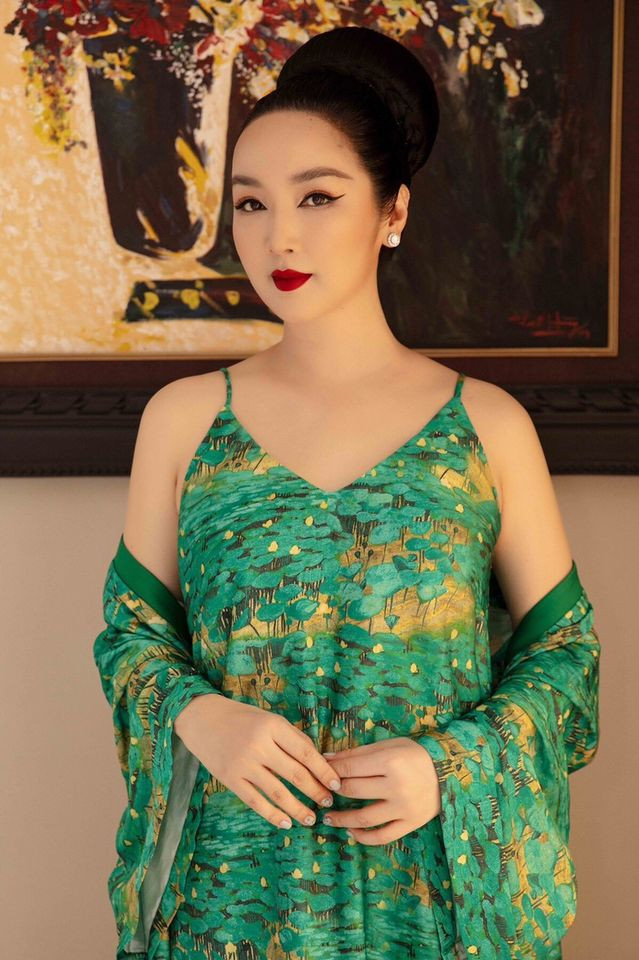 Người đẹp không tuổi diện chiếc váy hai dây có hoạ tiết tinh tế khoe vai trần quyến rũ.
