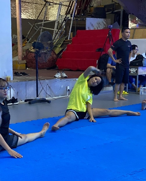 Hoa hậu Hoàn vũ Việt Nam 2017 diện trang phục đơn giản, năng động, tập luyện rất nghiêm túc trong phòng tập. Cô đã đầu tư rất nhiều tâm sức cho lần chạm ngõ với điện ảnh của mình.