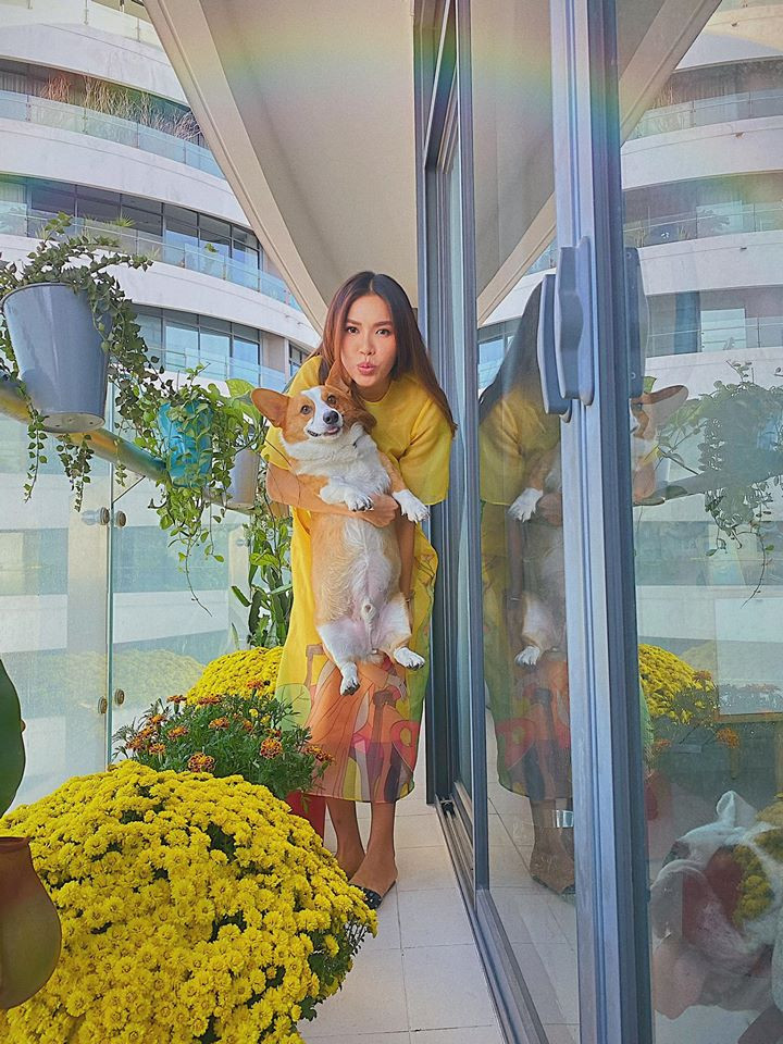 Cô khoe dáng bên chú cún cưng đáng yêu bên hiên nhà đầy hoa cỏ mùa Xuân.