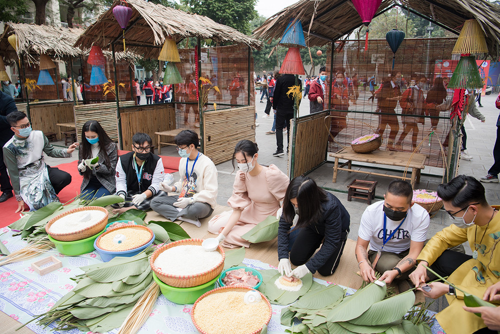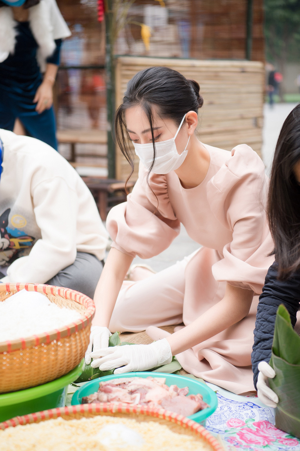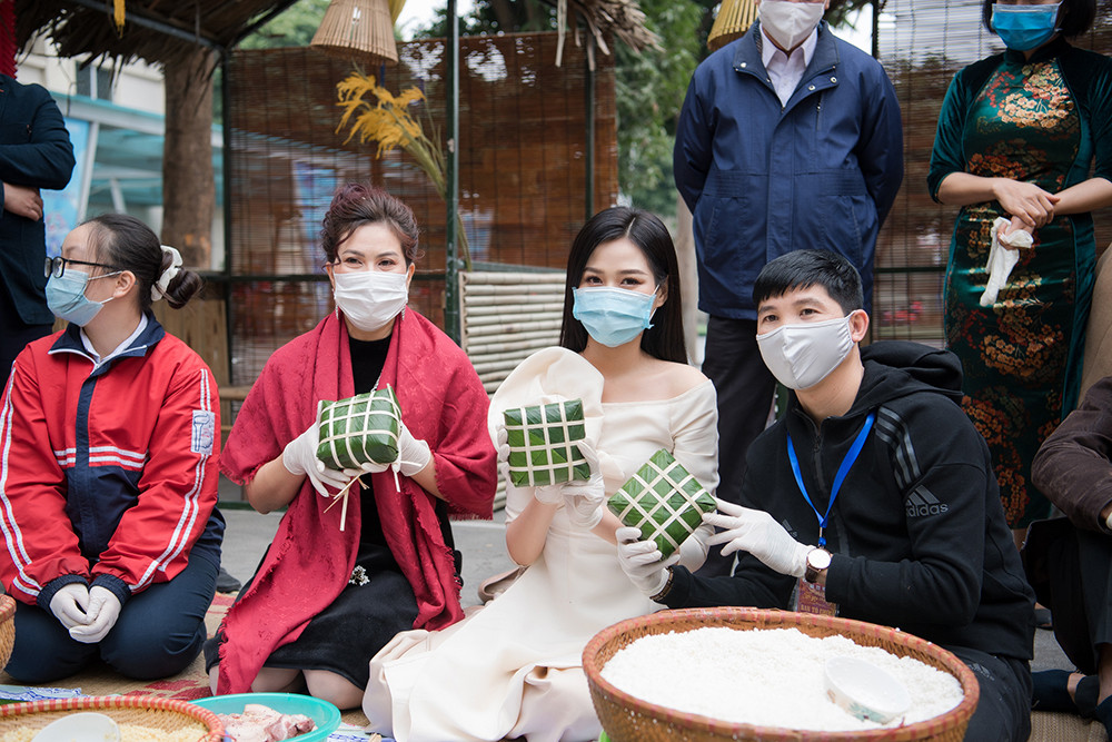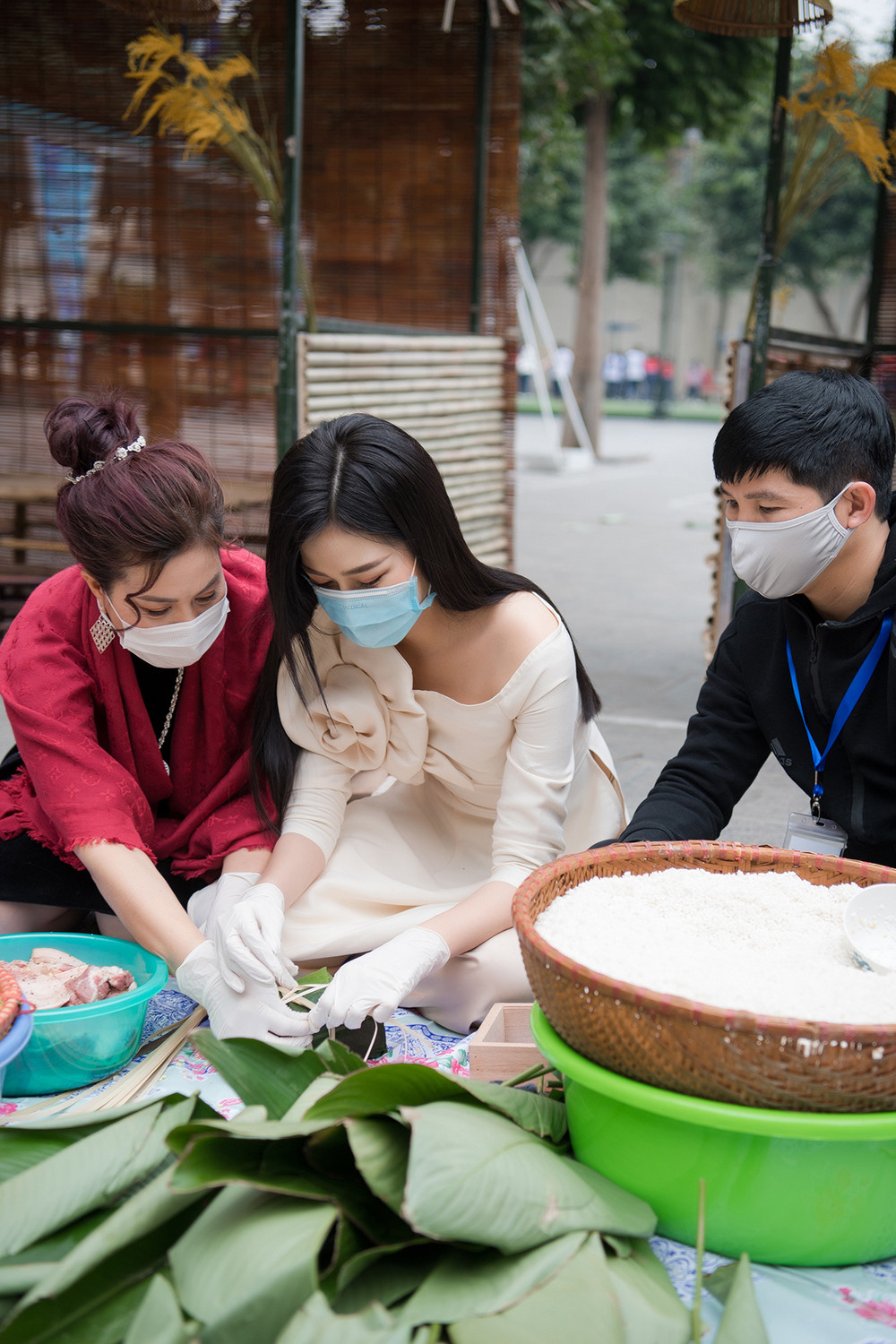Tại chương trình, hai nàng hậu xinh đẹp cũng vô cùng thích thú khi được trải nghiệm gói bánh chưng Tết cùng các vị khách mời.