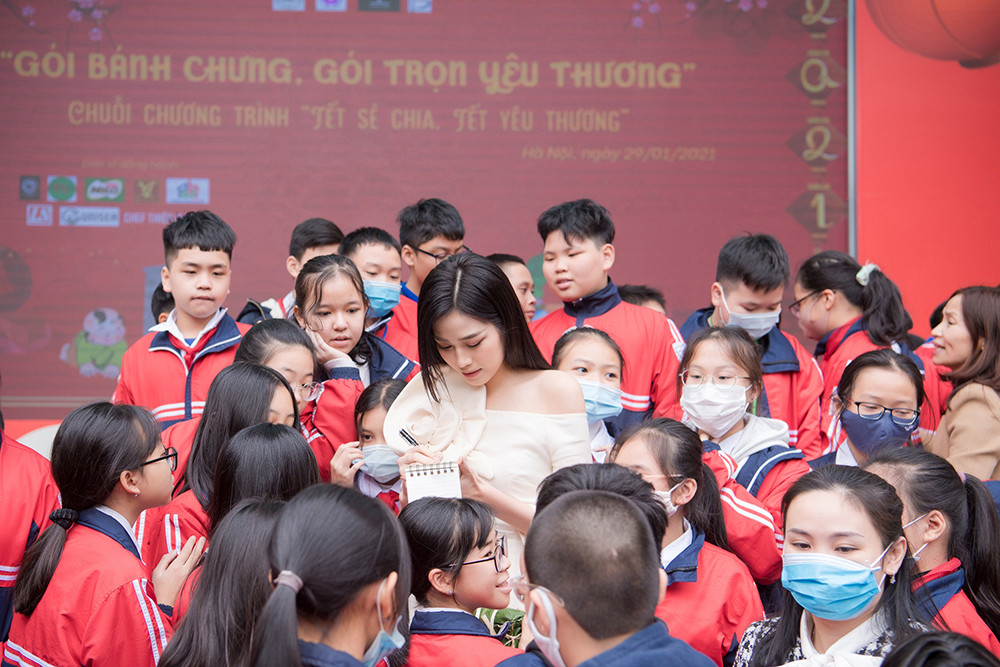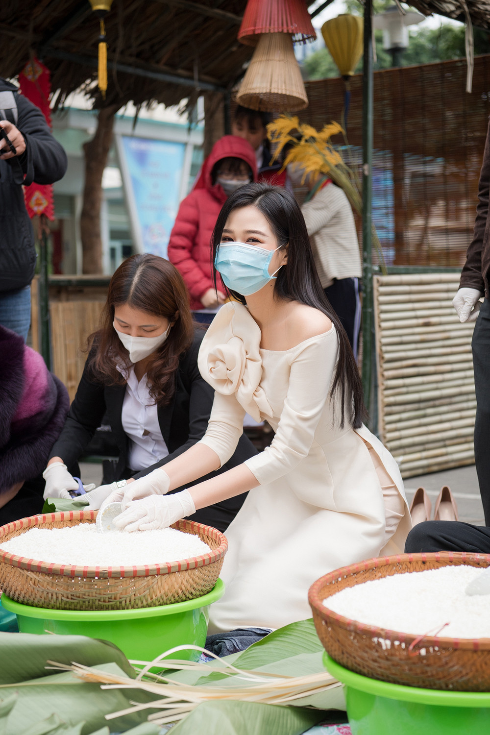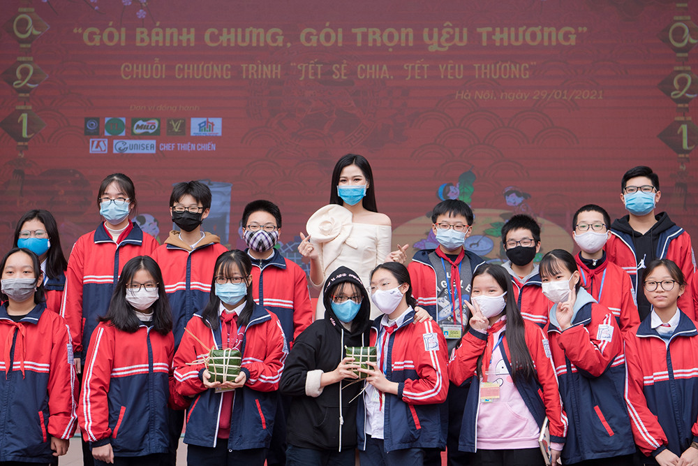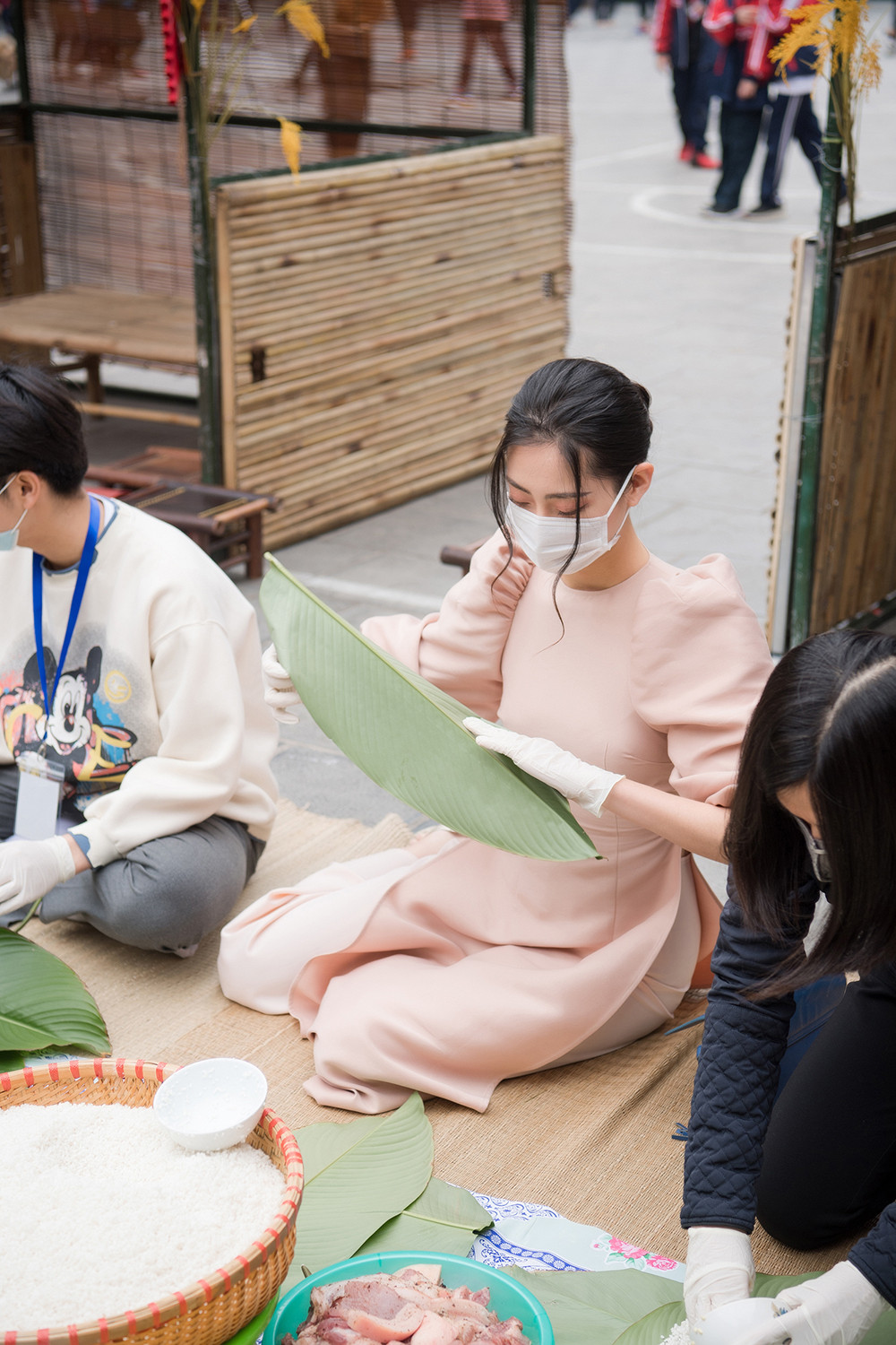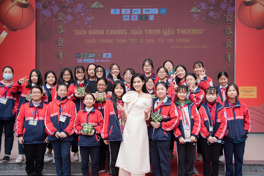 Hôm 29/1, Hoa hậu Đỗ Thị Hà đã tham dự chương trình “Gói bánh chưng, gói trọn yêu thương” tại trường THCS Dịch Vọng, Cầu Giấy, Hà Nội.