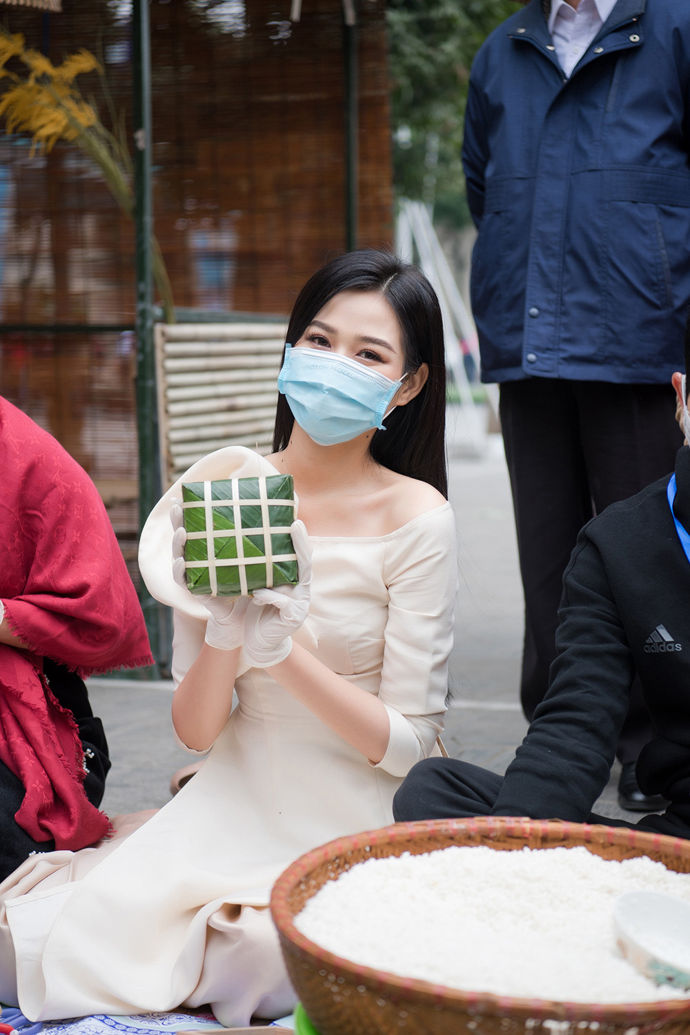 Hoa hậu Lương Thùy Linh cũng rất hào hứng khi được tham gia gói bánh chưng.