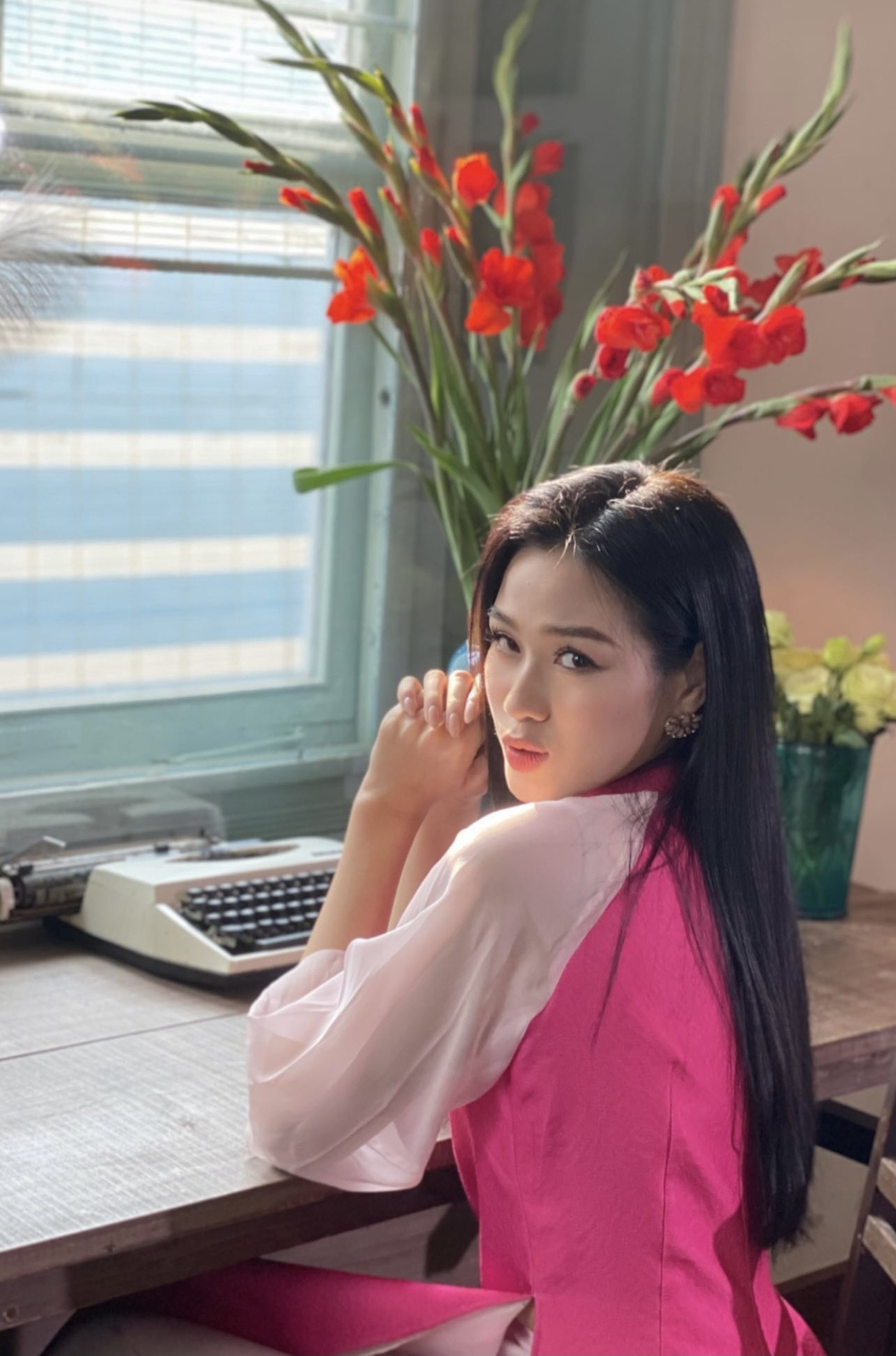 Hoa hậu Đỗ Thj Hà như mang không khí Tết về rất gần với trang phục áo dài gam màu hồng nền nã cùng bình hoa lay ơn đặc trưng của ngày Tết.