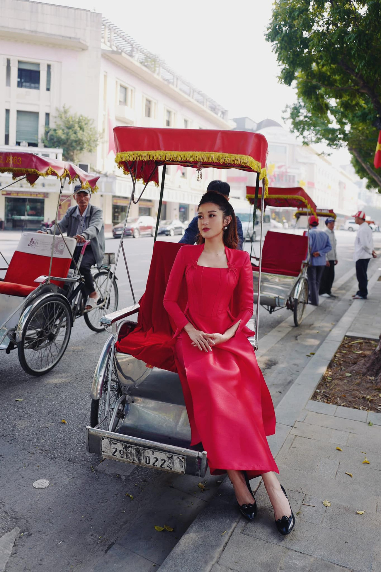 Người đẹp nổi bật trên phố trong tà áo dài gam màu đỏ rực, mang không khí Tết về rất gần.