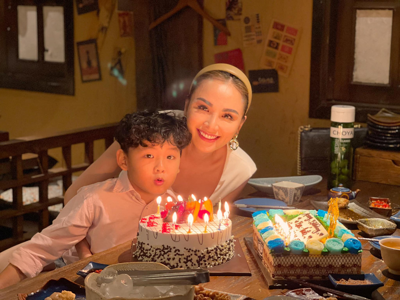 Hoa hậu Diễm Hương và con trai Noah trong buổi tiệc mừng sinh nhật bố của cô.