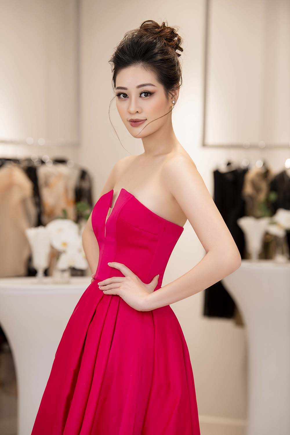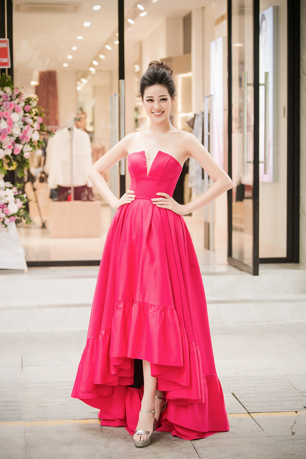 Trong tone hồng rực rỡ, Hoa hậu Khánh Vân chọn kiểu đầm thanh lịch, tôn vinh vóc dáng cao, kết hợp cùng tóc bới sang trọng, khác hẳn so với những lần xuất hiện trước đây của người đẹp.