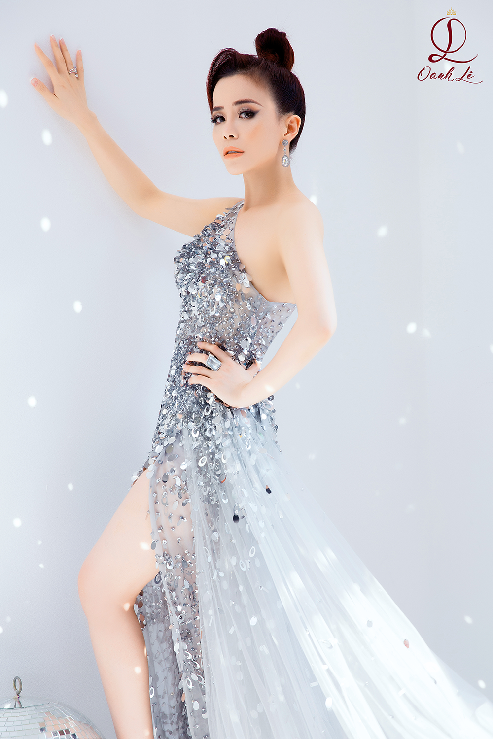 Form dáng vừa vặn và điểm nhấn ở kỹ thuật đính kết đá lấp lánh tôn lên đường nét sang trọng, gợi cảm của Oanh Lê.