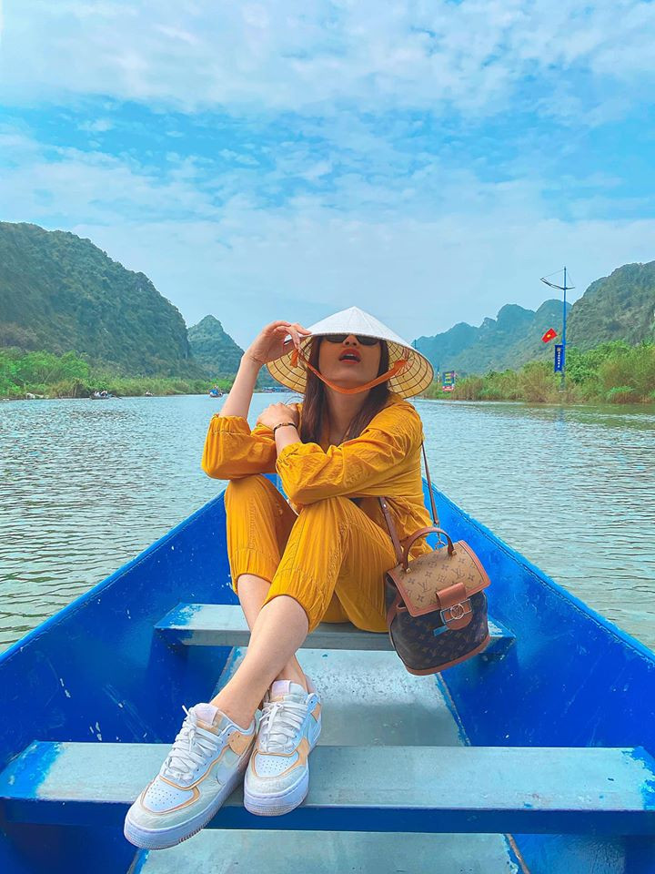 Á hậu Lệ Hằng tạo dáng 'bá đạo' khi thưởng thức khung cảnh sông nước.