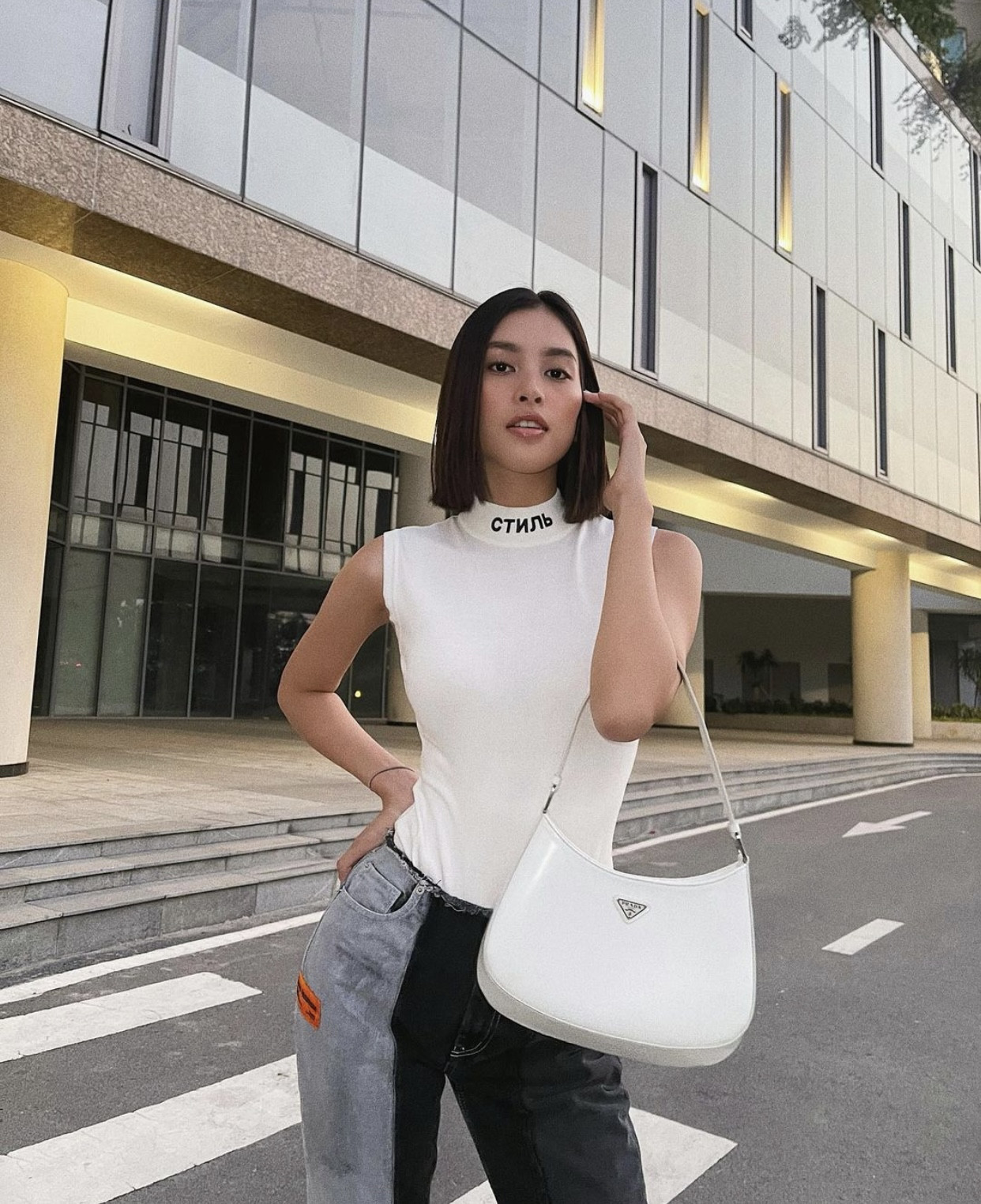 Hoa hậu Việt Nam chỉ diện trang phục đơn giản gốm áo khoét nách kết hợp cùng quần jeans với hai tông màu đơn giản đen-trắng nhưng vẫn nổi bật với vẻ xinh đẹp, hút hồn.