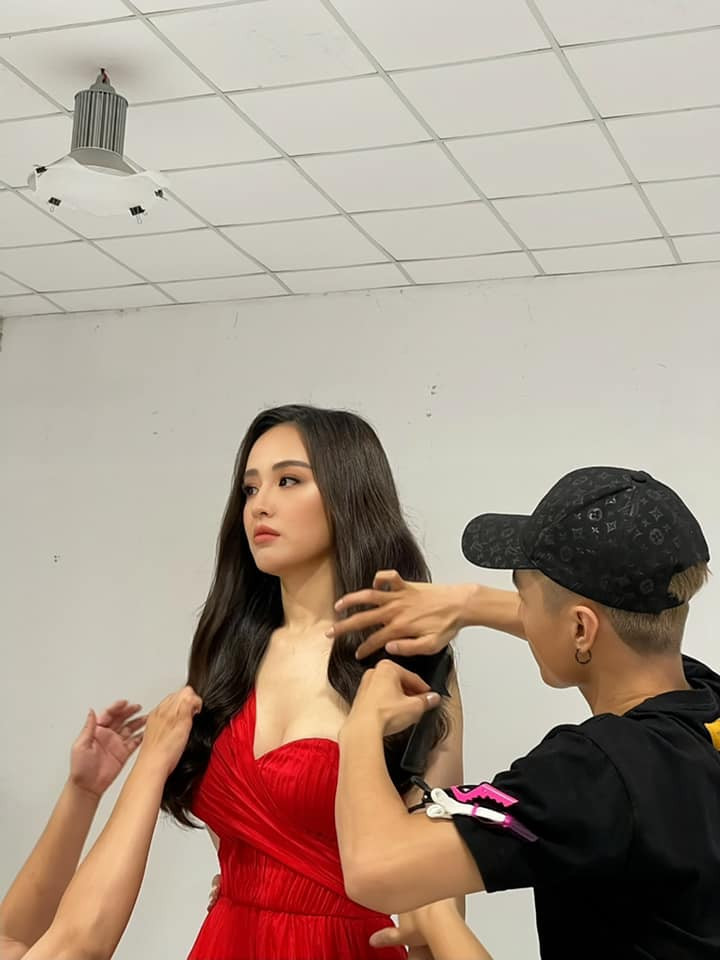 Trong hình ảnh hậu trường mới được hé lộ, Hoa hậu Mai Phương Thuý diện váy dạ hội cúp ngực màu đỏ vô cùng nóng bỏng và quyến rũ.